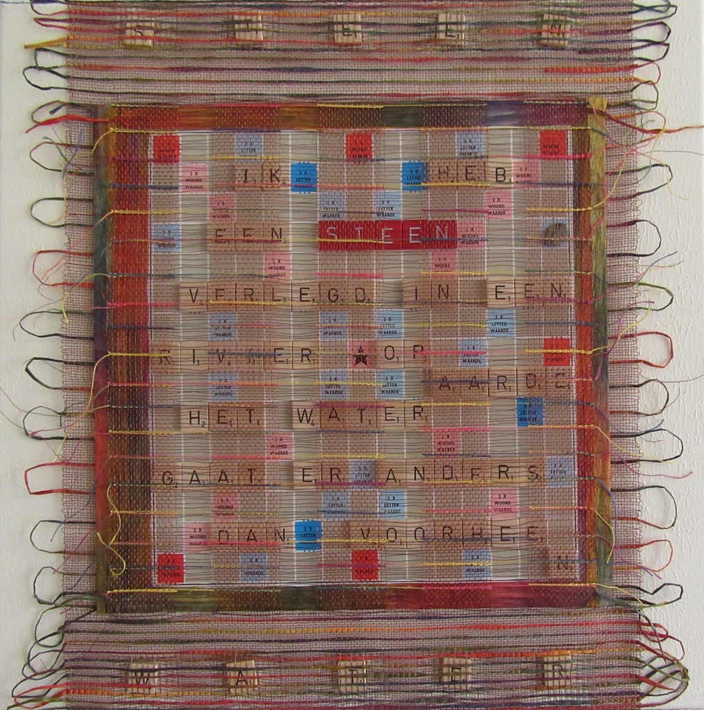 'een steen' het lied van bram vermeulen in een weefwerk: scrabble, koper, papier