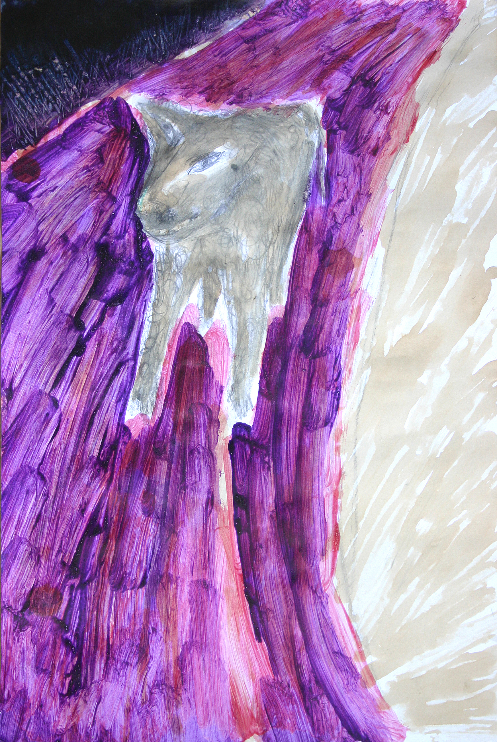 hond op weg in de nacht (acryl, inkt, potlood, shoyu op karton)
