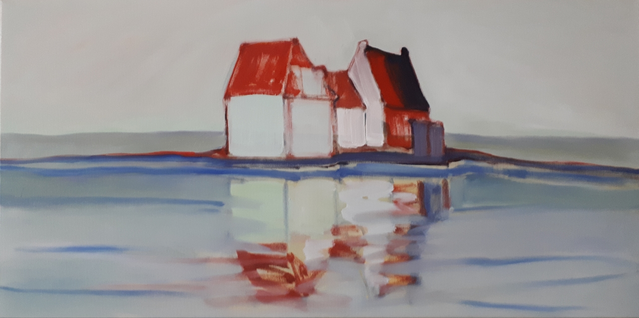 Minimalistische en verstilde weergave van een paar huisjes die bestaan in een oneindige ruimte en tijd.