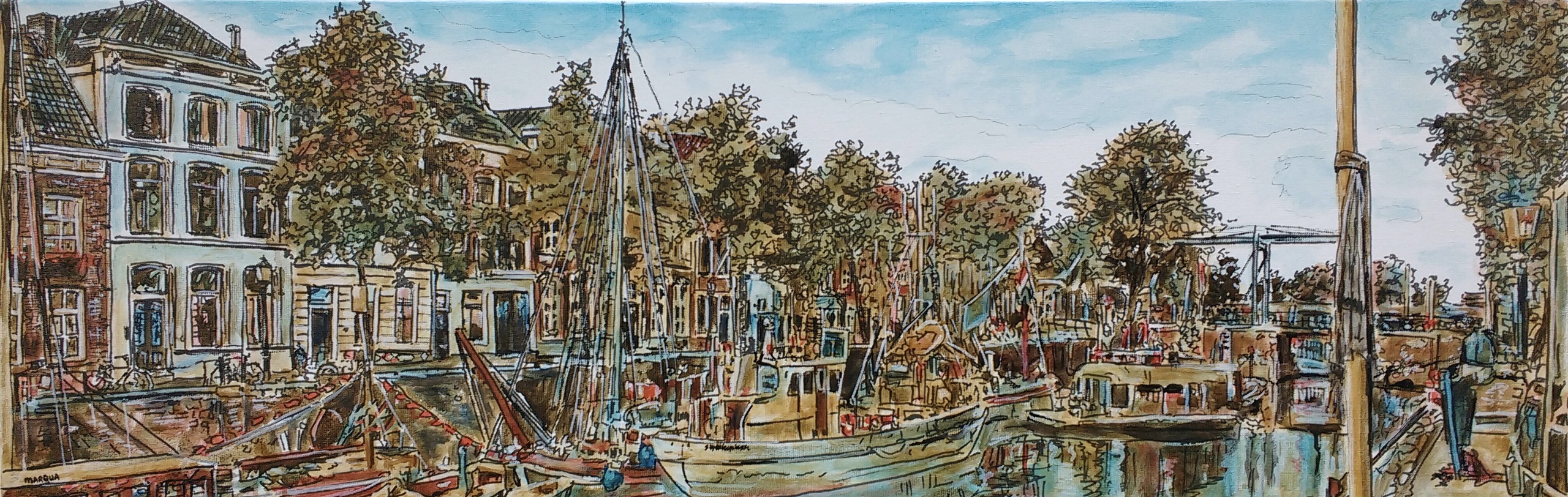 Brede Haven, Den Bosch Maritiem, Boombrug, Oliemolensingel. Inktschilderij op linnen doek 40x120 cm. Getekend en geschilderd met rietpen en penseel in Oost-Indische en meerdere kleuren inkt.
