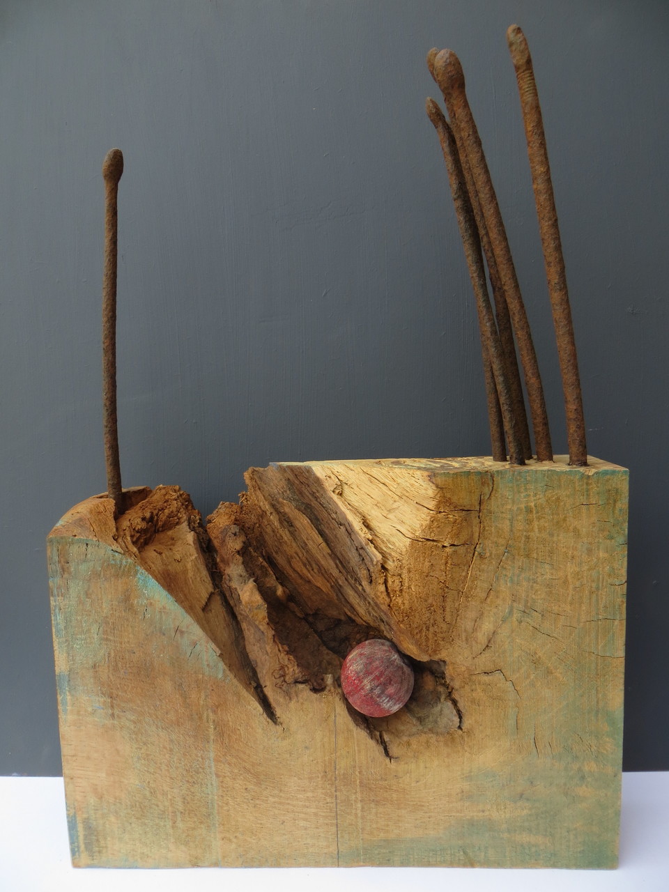 Iets dat inslaat als een bom haalt alles overhoop. Helder nadenken is moeilijk. Werk uitgevoerd in hout en metaal.