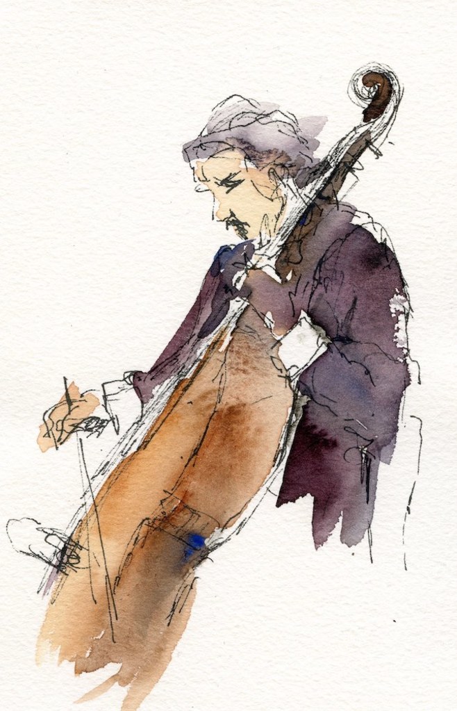 Verkocht. Geschetst tijdens concert in het concertgebouw. Pen en aquarel op papier met passe partout en naturel houten lijst.