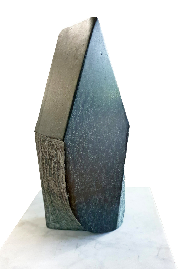 Met een hint naar een huis, maar net anders. Mooi contrast van gladde en ruwe vlakken.