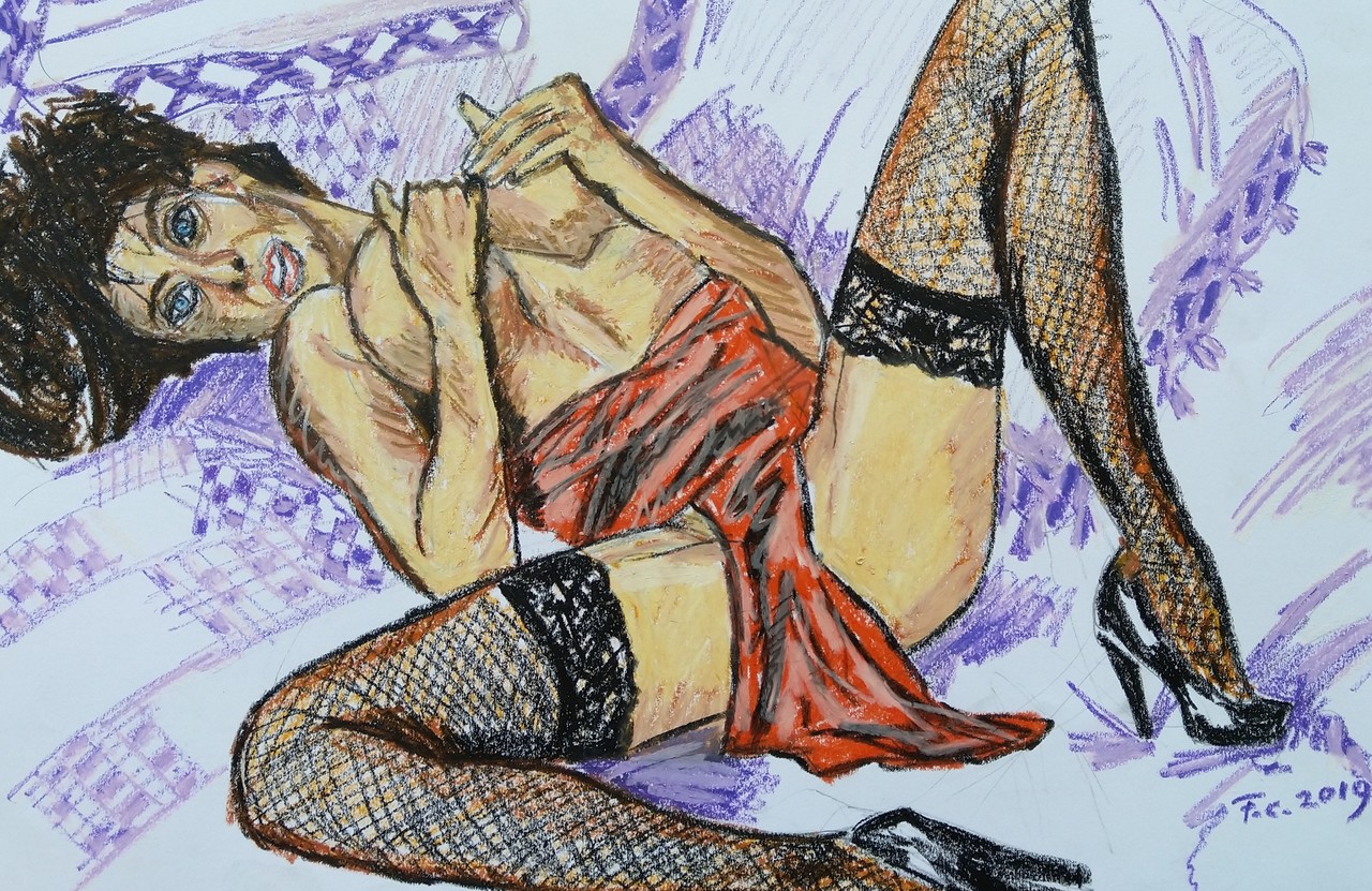 Vrouw op bed in potlood en oliepastels
