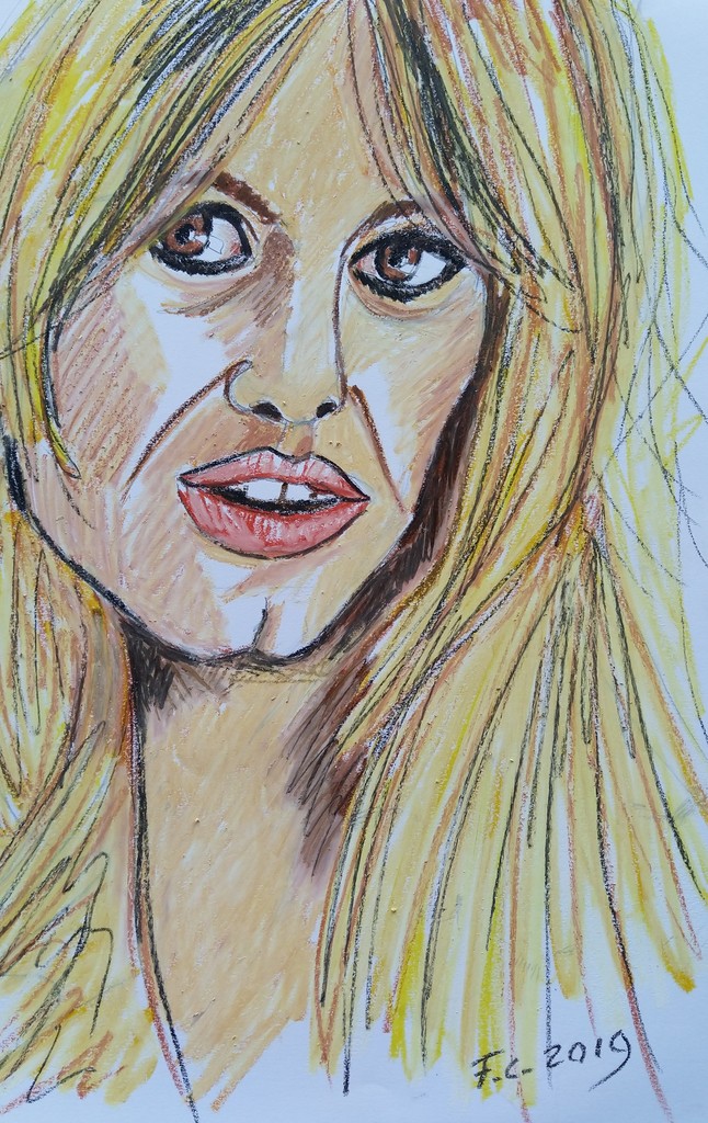 Bardot in potlood en oliepastels.