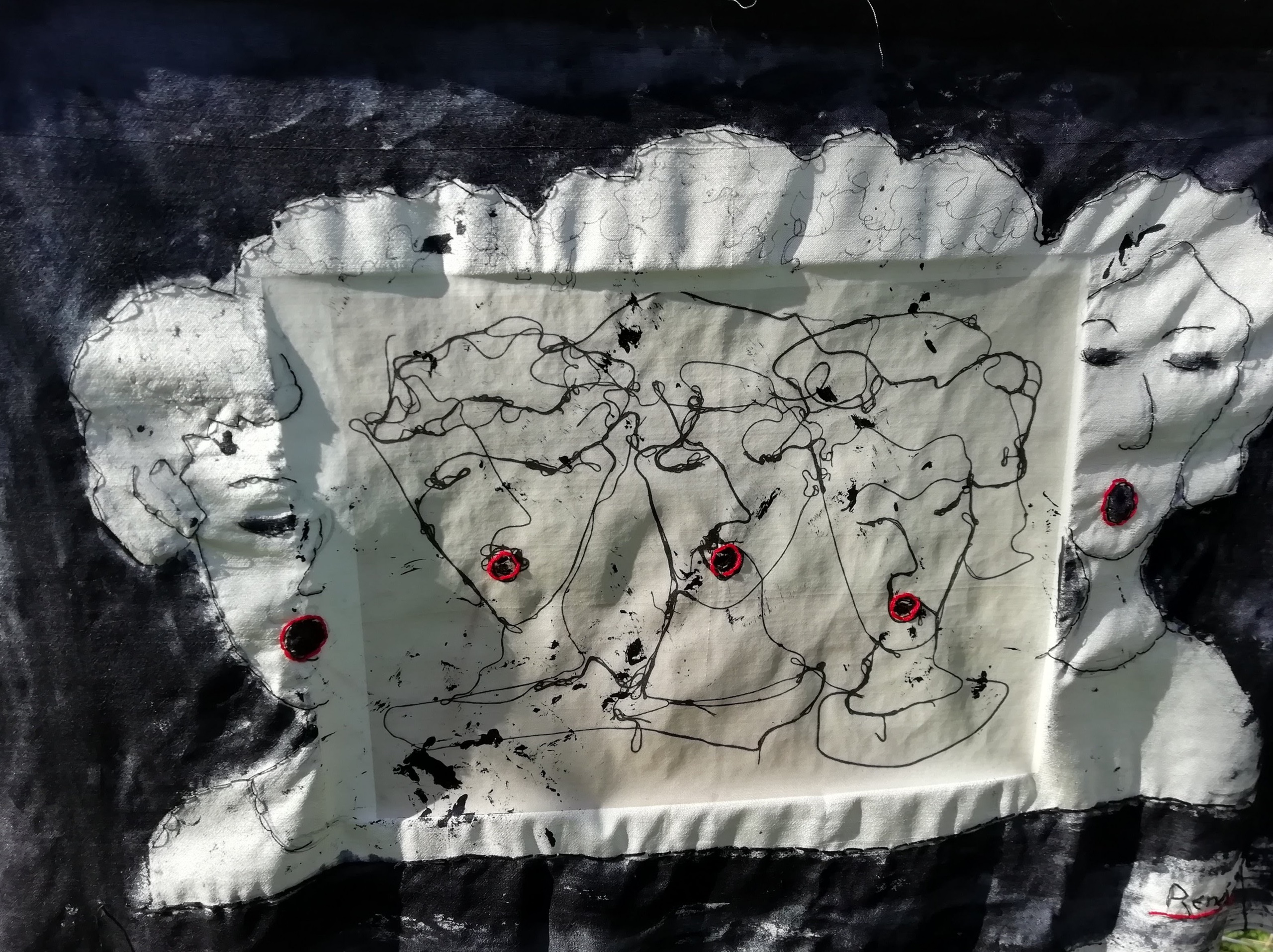 in de serie Zingen transfer (van een foto van een "draadfiguur"), textielverf en borduurwerk op zijde, dit is de achterkant. Deze vormt de basis voor mijn andere werk Connected