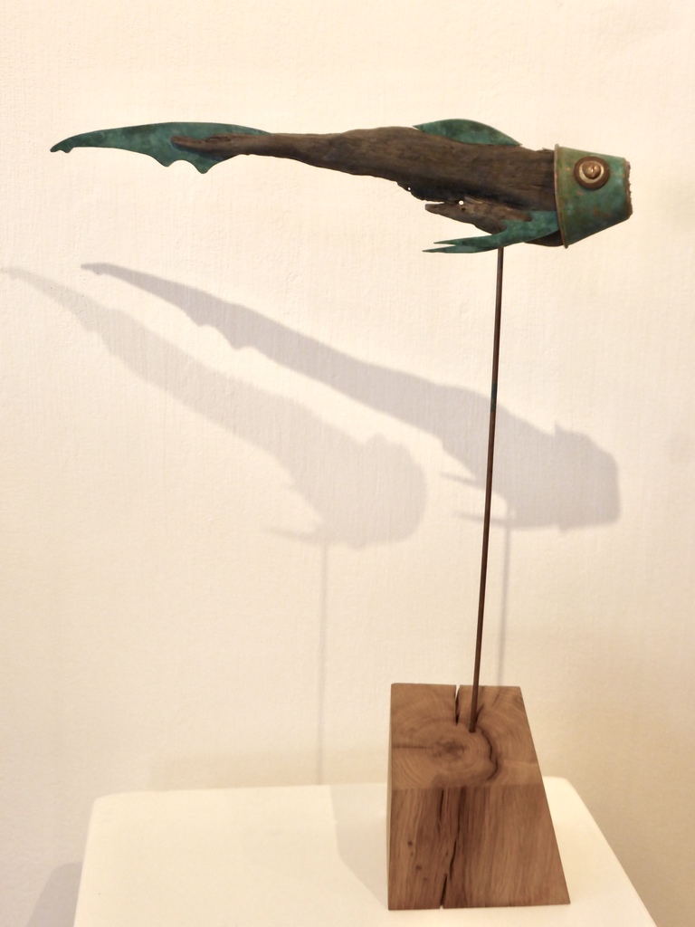 Maakt vissen. Vissen van drijfhout, wrakhout, vindhout en zaagafval. En natuurlijk oude verfblikken, koperen meuk, moertjes, knopen en alles wat verder nog onder schroot valt. En beleeft daar een kinderlijk plezier aan.