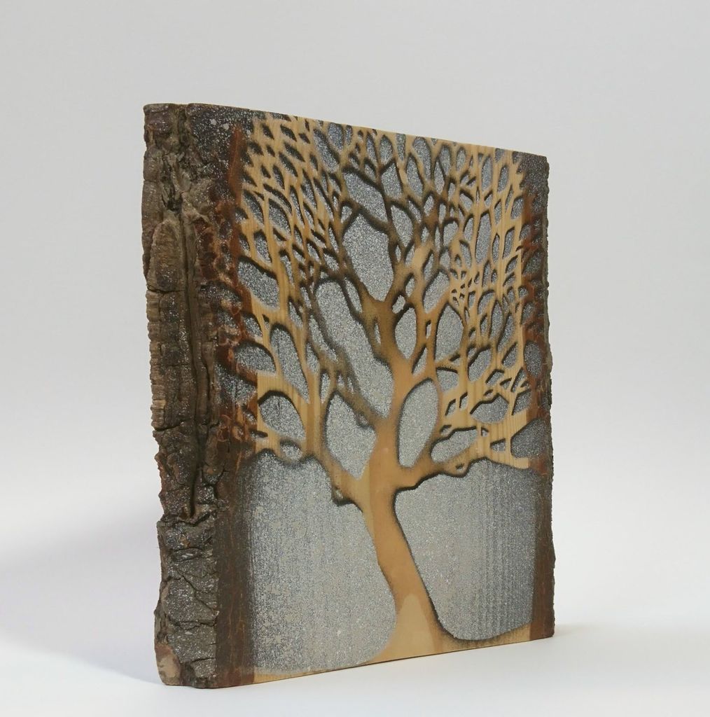 Plankje van douglashout met schors waarop een vorm van een eik is gespoten. Het plankje heeft een bevestigingshaakje om aan de muur te hangen.