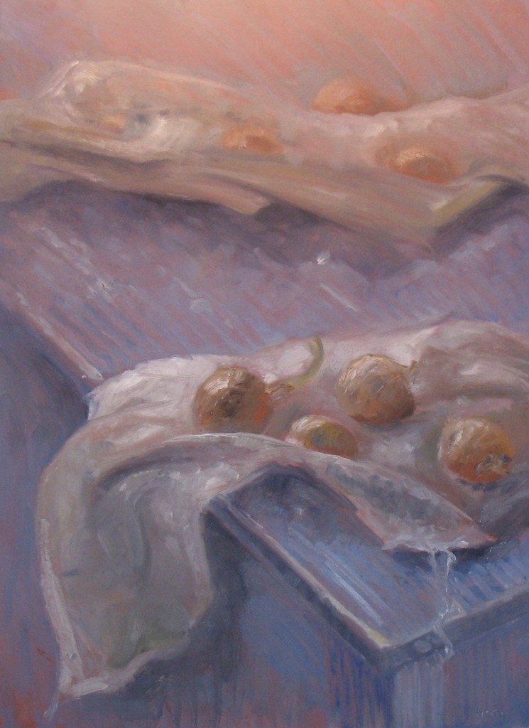 Schilderij in pastelkleuren van uien op een doek. Dit gaat natuurlijk niet echt om het uitbeelden van uien, maar meer om compositie met vorm en kleur!