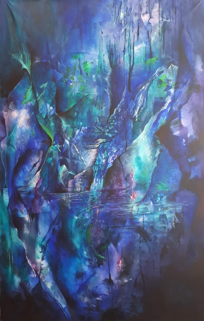 Schilderij Blauw Mystiek Water Geest Doek Rots Acrylverf Groot En Grot Stenen Formaat Waterplanten Zoeken Verschijnen