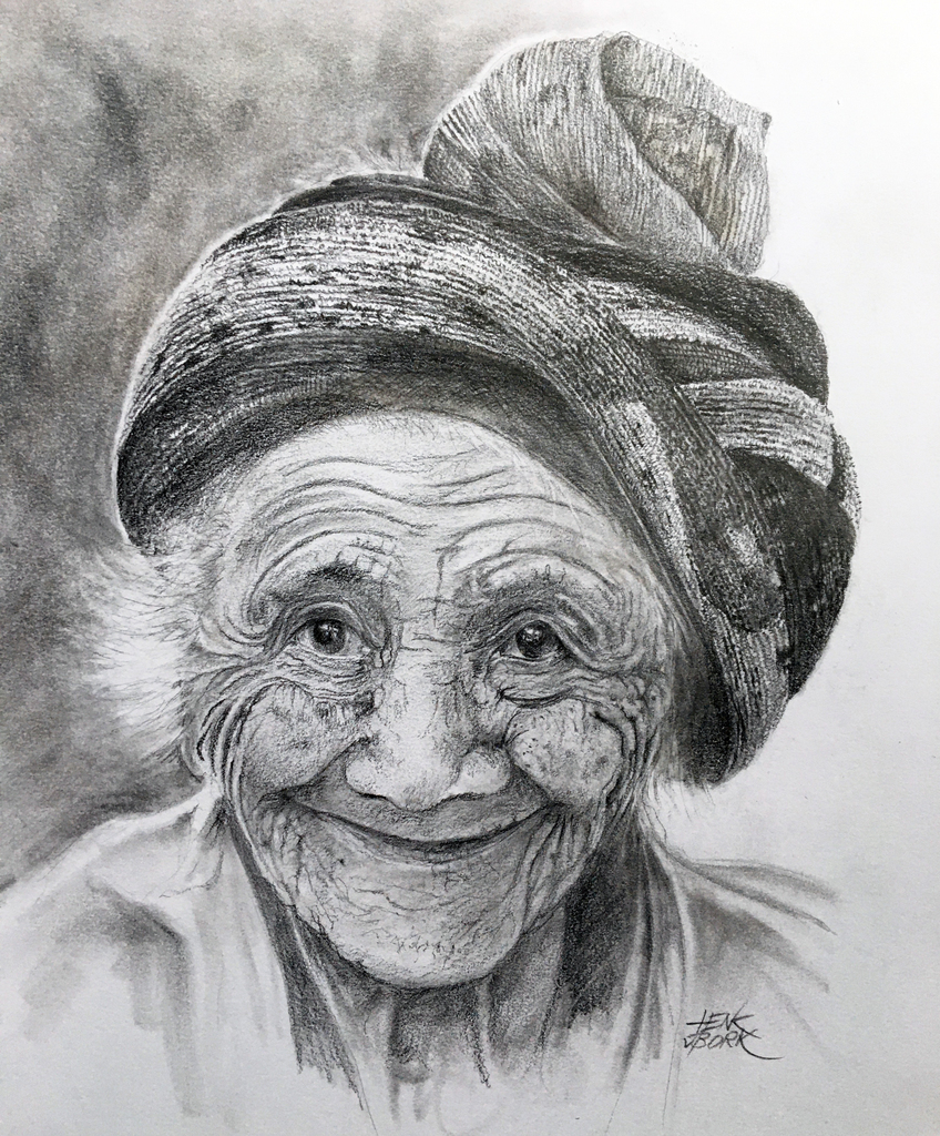 Portret van een oude Asiatische vrouw door het leven getekend