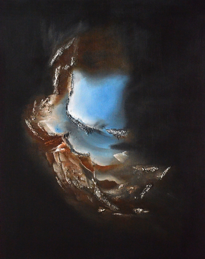 De kosmische ruimte is het uitgestrektheid voorbij hemellichamen en hun atmosferen, Het bevat ultralage neveaus van deeltjesdichtheden, die een bijna perfect vacuüm vormen van voornamelijk waterstof- heliumplasma, doordrongen van elektromachnitische straling, kosmische straling, neutrino's, magnetische velden en stof. Ruimtelijke weergave die wij alleen met een telescoop kunnen zien. H2Olieverf op paneel 40 x 50 cm. november 2019.