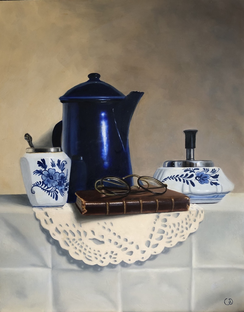 Emaille Koffiepot Schilderij Olieverf Stilleven Blauw Delfts Kleedje Gehaakt Servet Boek Bril