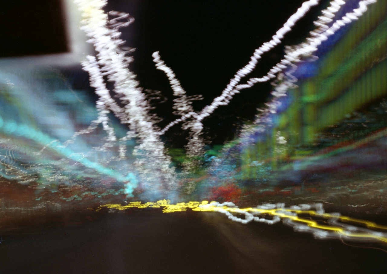 Uit de oude doss. Analoge langtijd fotografie. 's Nachts rijdend in de auto op de snelweg.