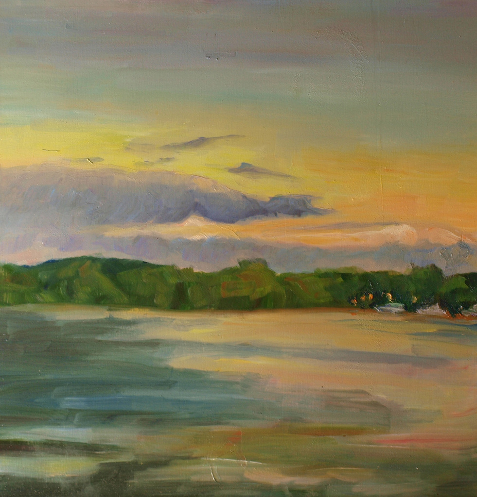 Water Natuur Kerst Avondzon Ondergaandezon Pleinair Pleinairschilderij Zonsondergang Weerspiegeling Eiland Vergezicht Bomen Olieverf Olieverfschilderij