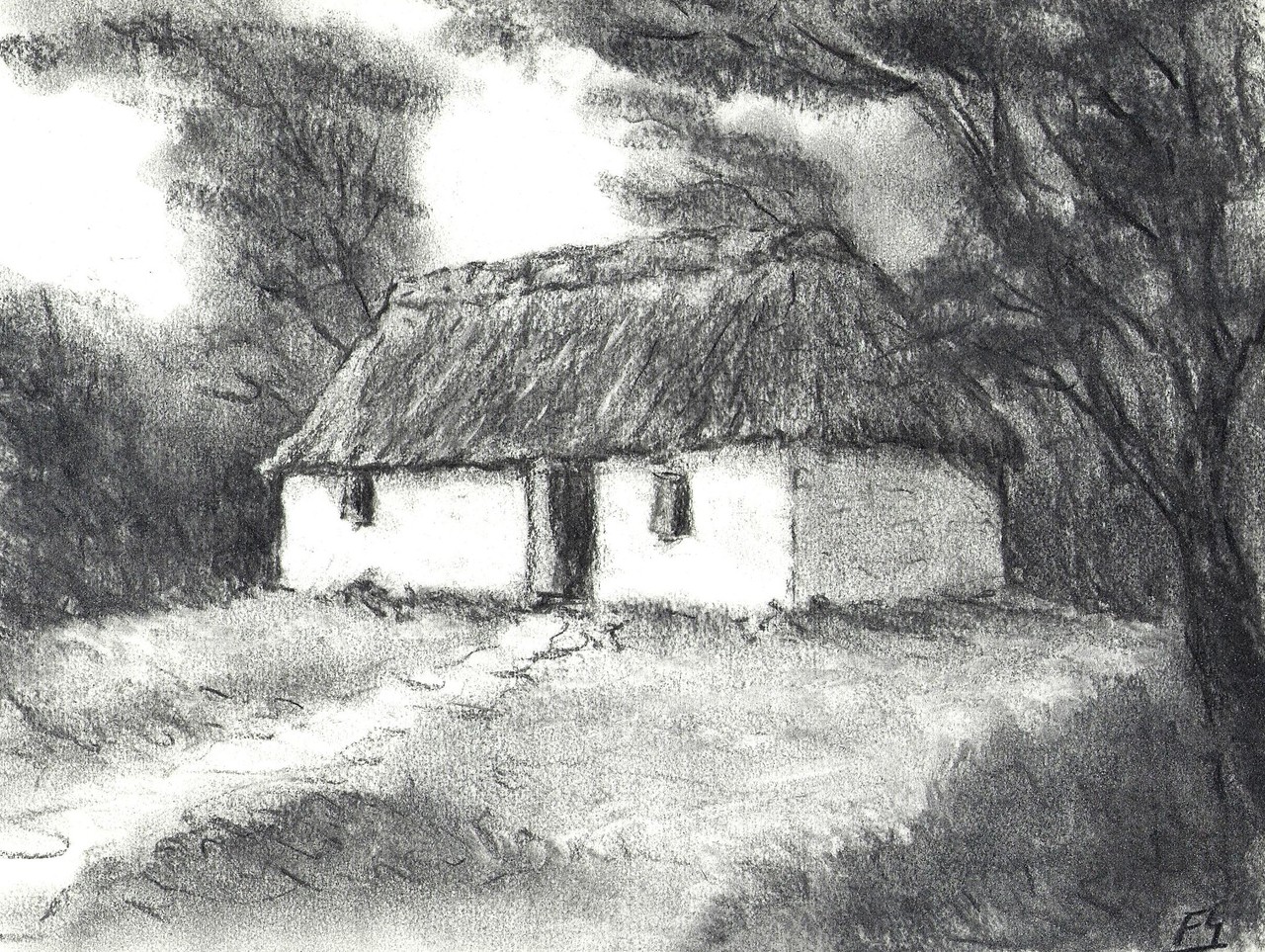 Losse studieschets in houtskool van een oud huisje in het bos met een rieten dak.
