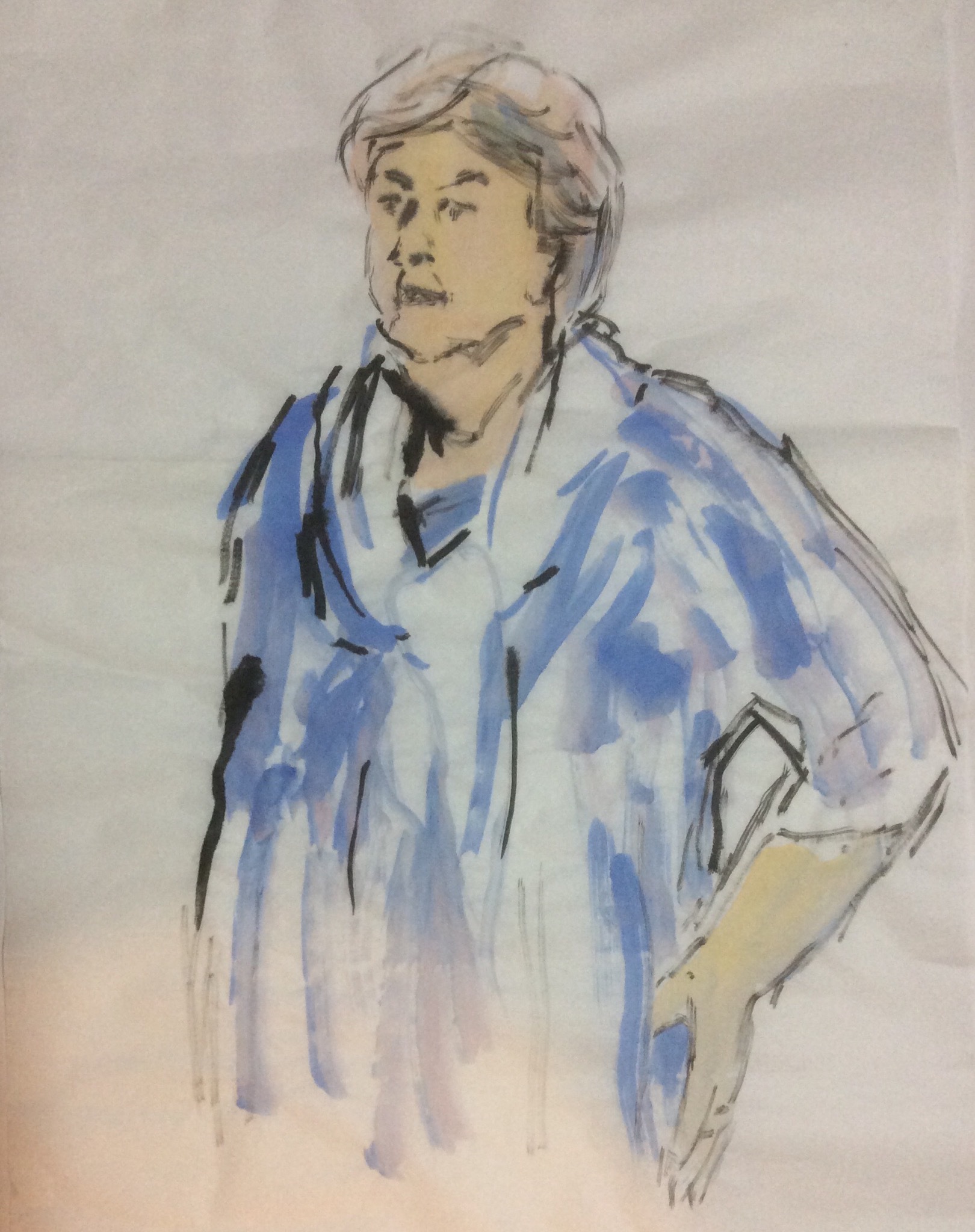 Vrouw met handen in de zij in aquarel en inkt