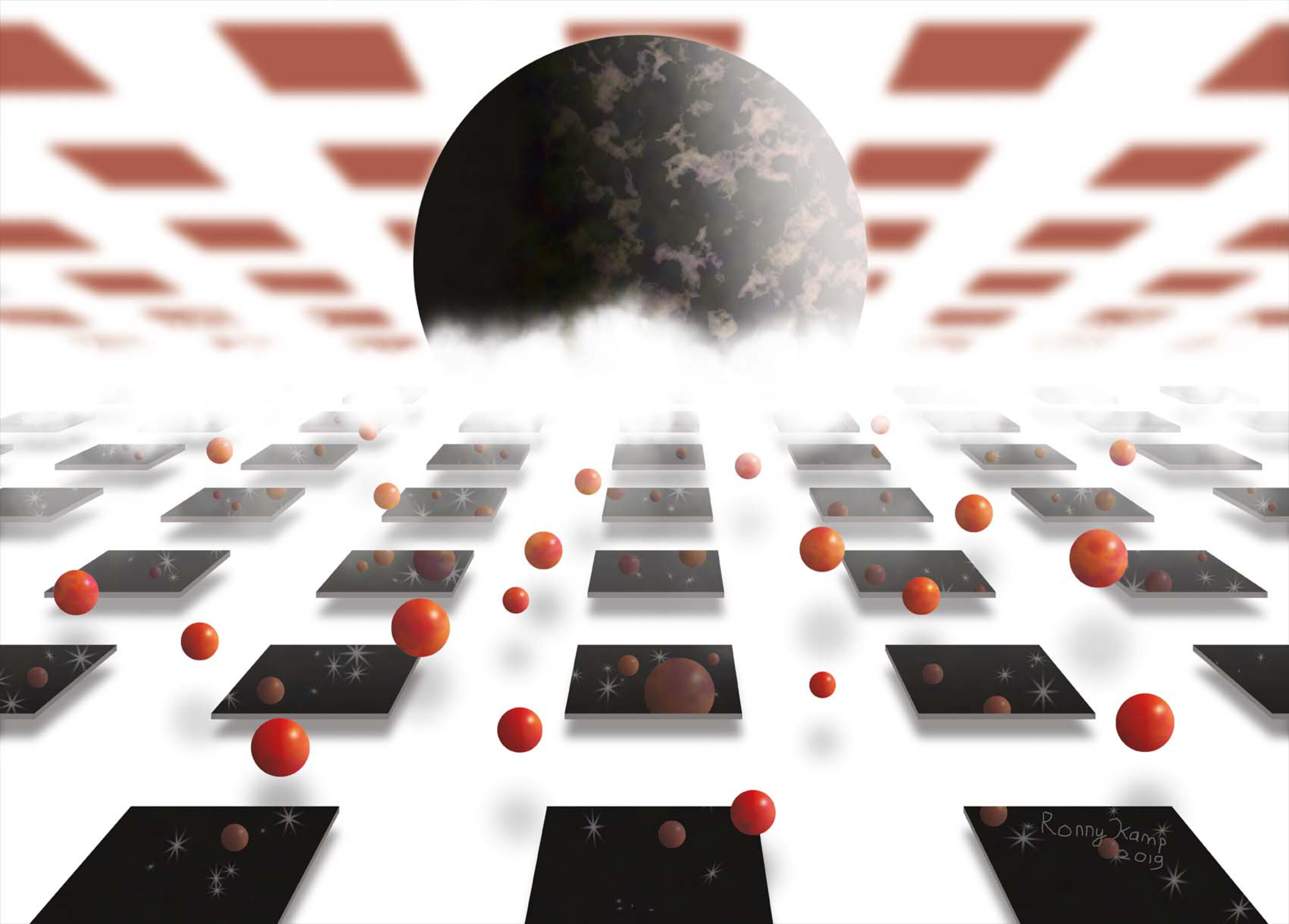 zwarte panelen op witte ondergrond, die zich uitstrekken in de verte. Rode ballen vallen. Vierkante rode wolken in de lucht. De realiteit neemt oneindige vormen aan.