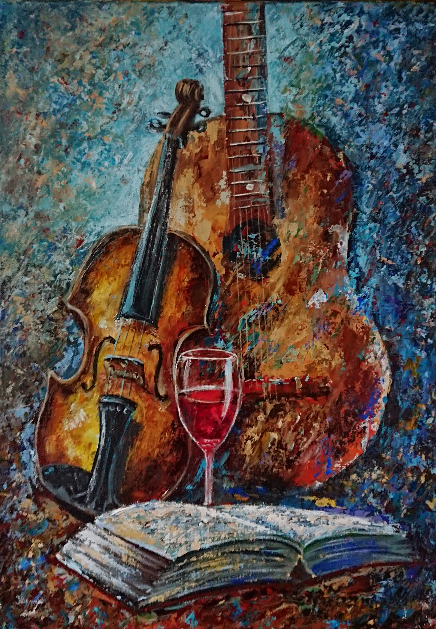 Viool en gitaar met boek en glas wijn Acryl op doek(werk in opdracht)