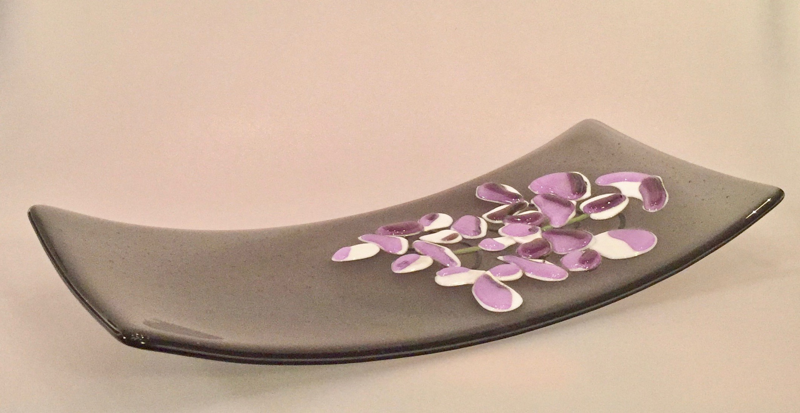 Boven op 2 lagen glas (die al waren gefused) is met kleine stukjes gekleurd glas een blauweregen gemaakt. Een tweede stook (tack-fuse) was nodig om om deze stukjes te laten samensmelten op de onderlaag, maar dan zo dat de blauwe regen in reliëf op de onderlaag ligt. Daarna volgde een derde stook om de schaalvorm te creeëren.
