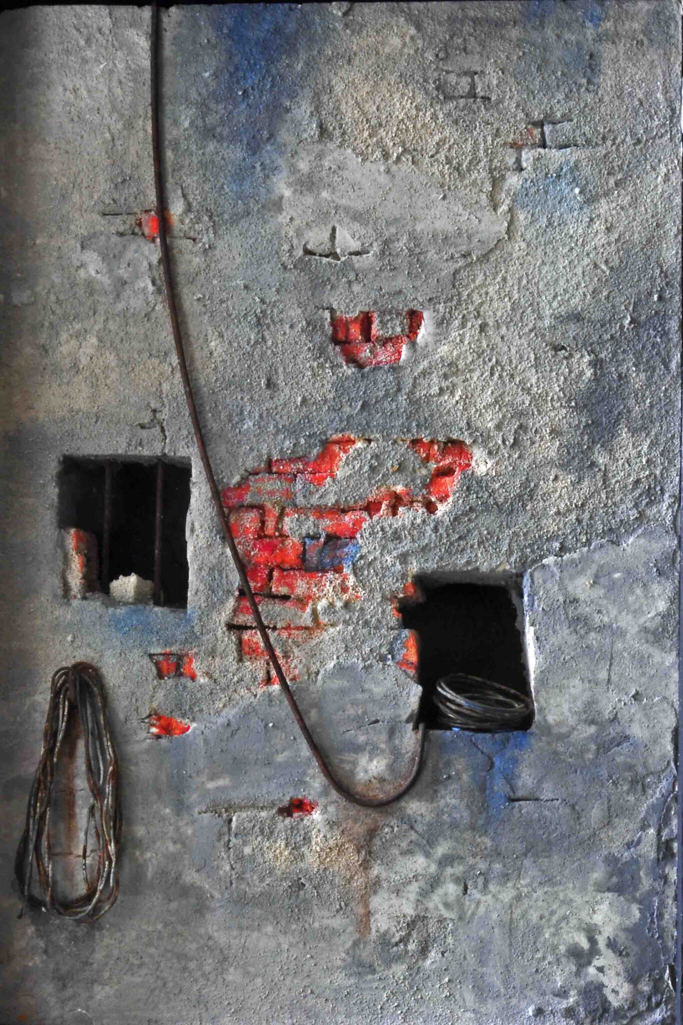 Met cement afgestreken baksteenmuur met kabels