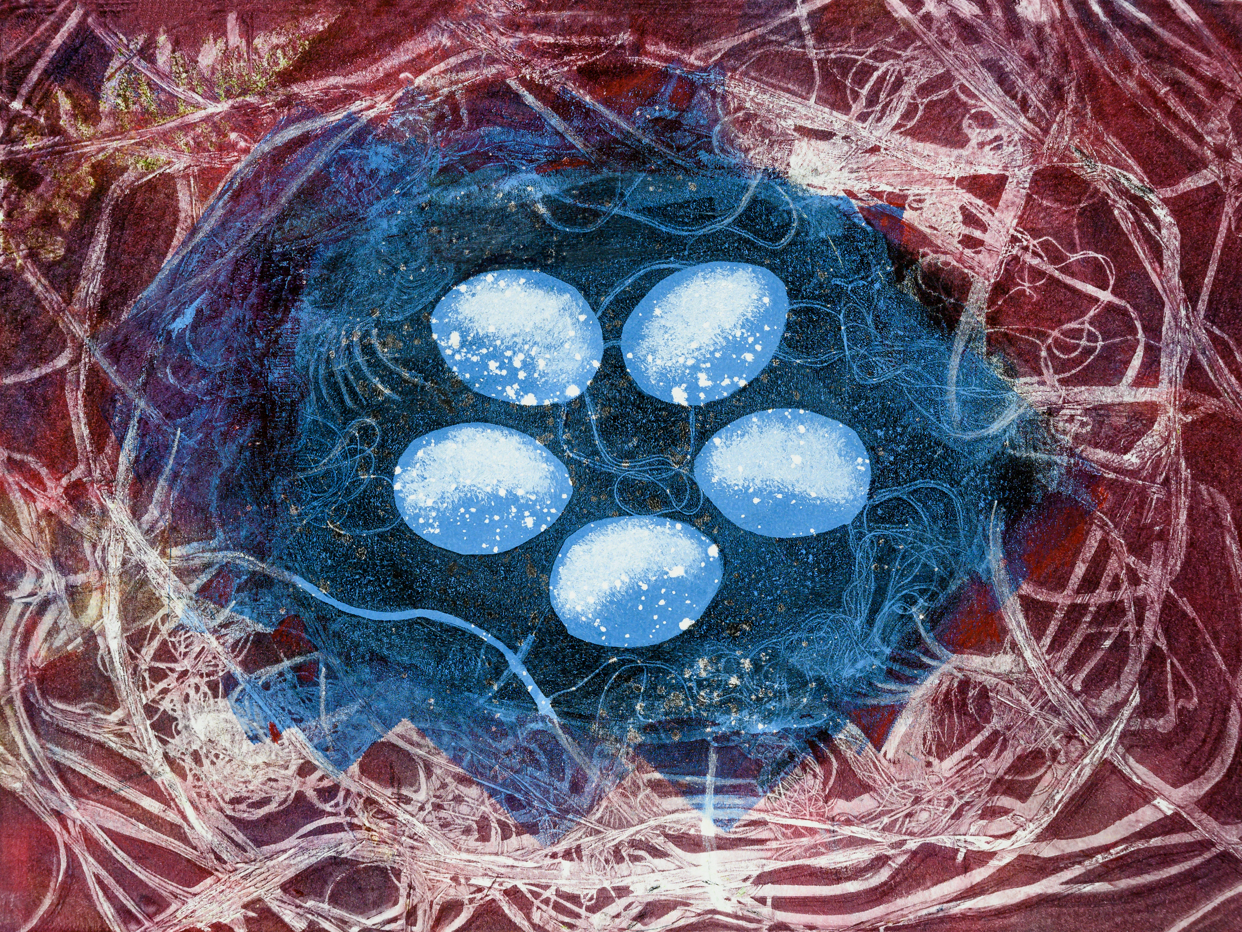 Monoprint Monotype Blauw Paars Vogelnest Ei Eieren Lente