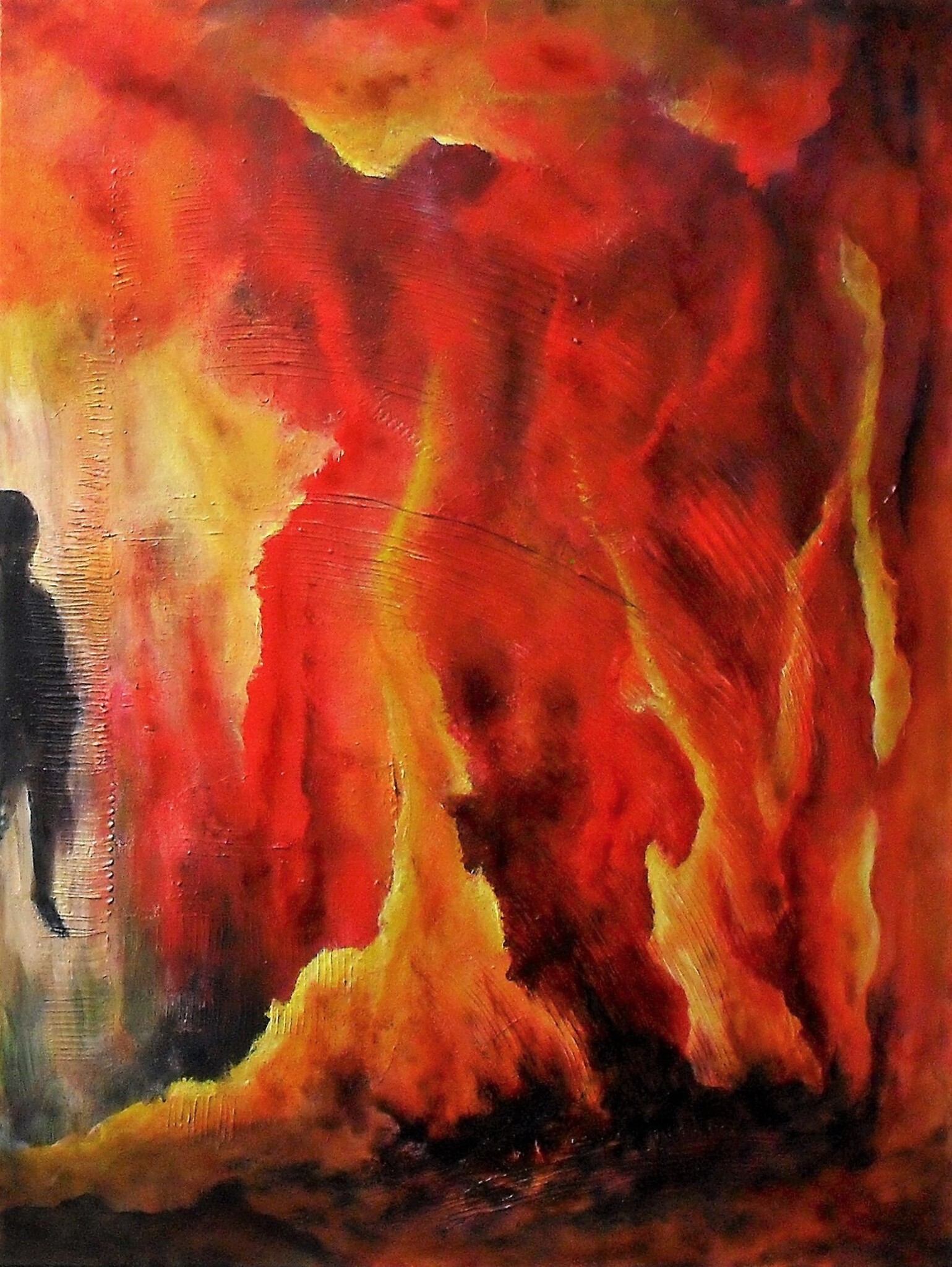 Soms doet het leven pijn en het voelt alsof alles brandt. Soms weet je niet waarom, maar het enige wat je wilt doen, is alles afbranden. Terwijl ik dit stuk schilderde, zat ik ergens tussen die twee gevoelens in.