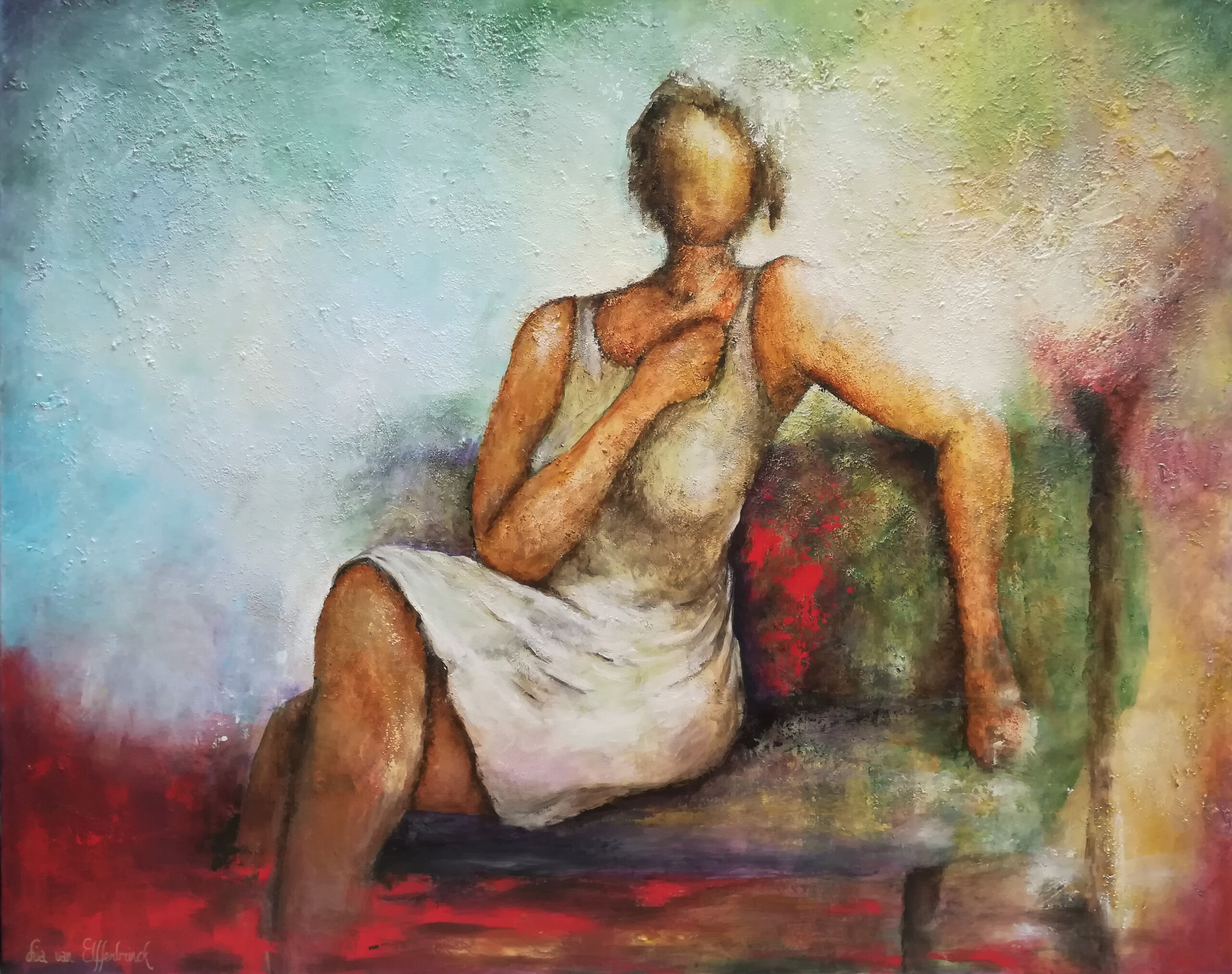 Vrouw Dame Gevoel Geen-spijt Spiritueel Zittend Vrouwelijk Figuur Bank Jurk Gevoelens Kleurrijk Symboliek Symbolisch Schilderij