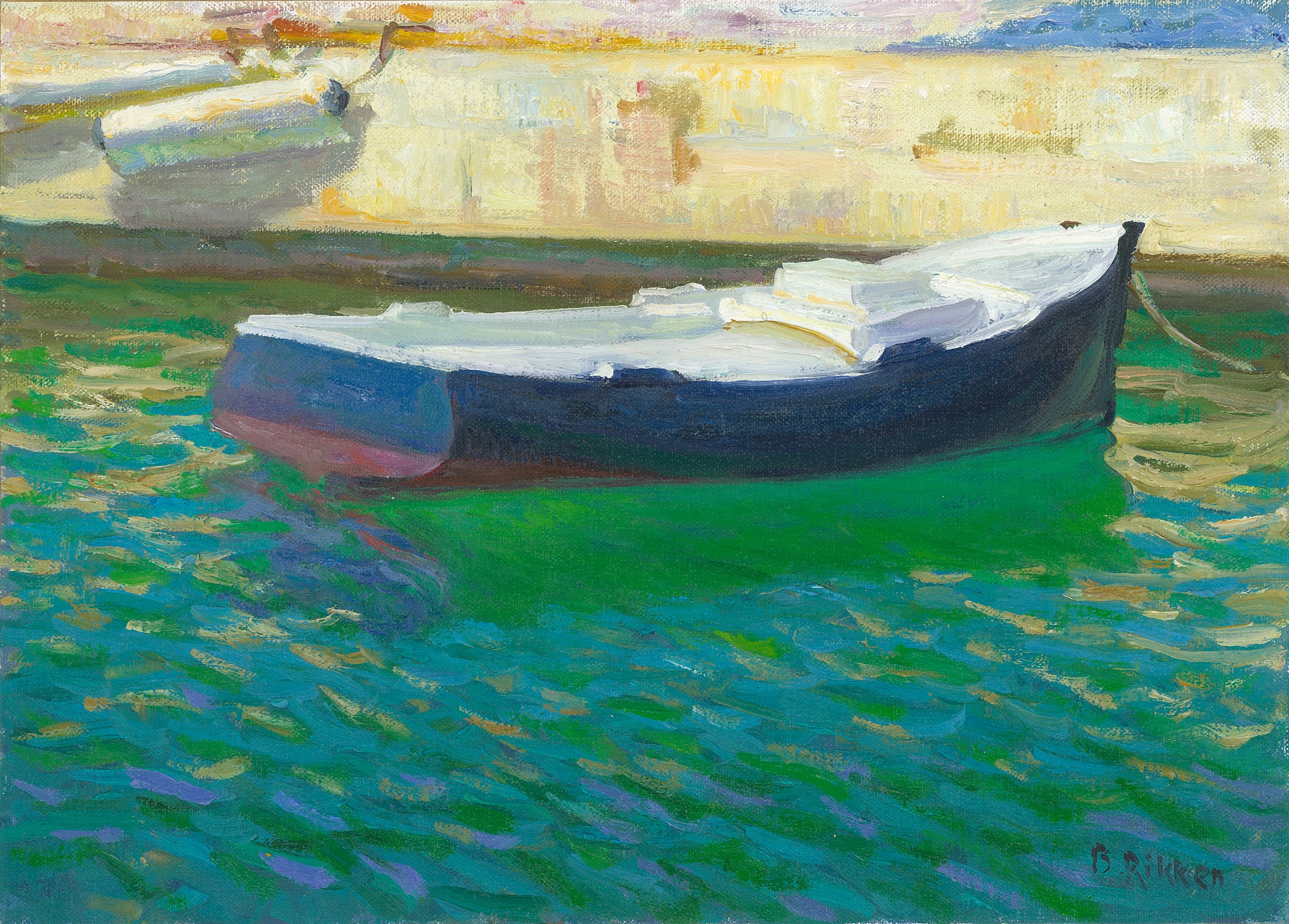 Altijd wel een onderwerp te vinden in zo 'n Spaanse haven: visserboten, vissers die netten boeten, boten in het water, en telkens spannend van kleur.Zie ook : https://www.benrikken.nl/landschap--spaans--paisaje-espanol-klein-formaat--landscape-spanish-small-size
