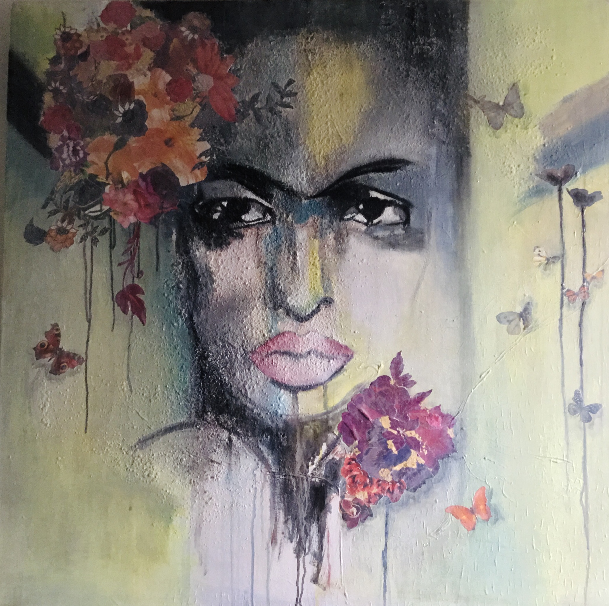 Abstract portret in gemengde techniek, lichte kleurgebruik, en collage.