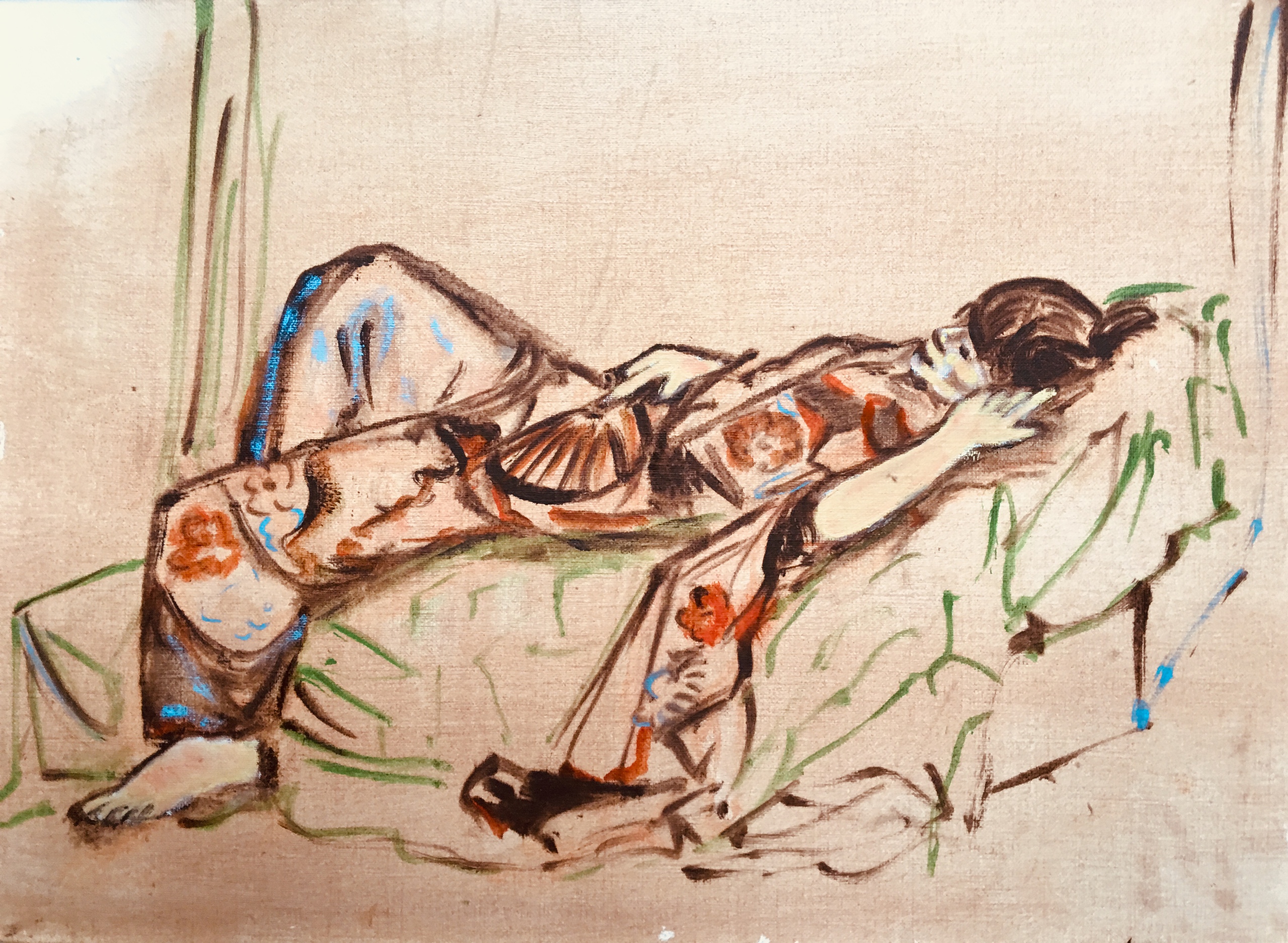 Liggend meisje met waaier en kimono