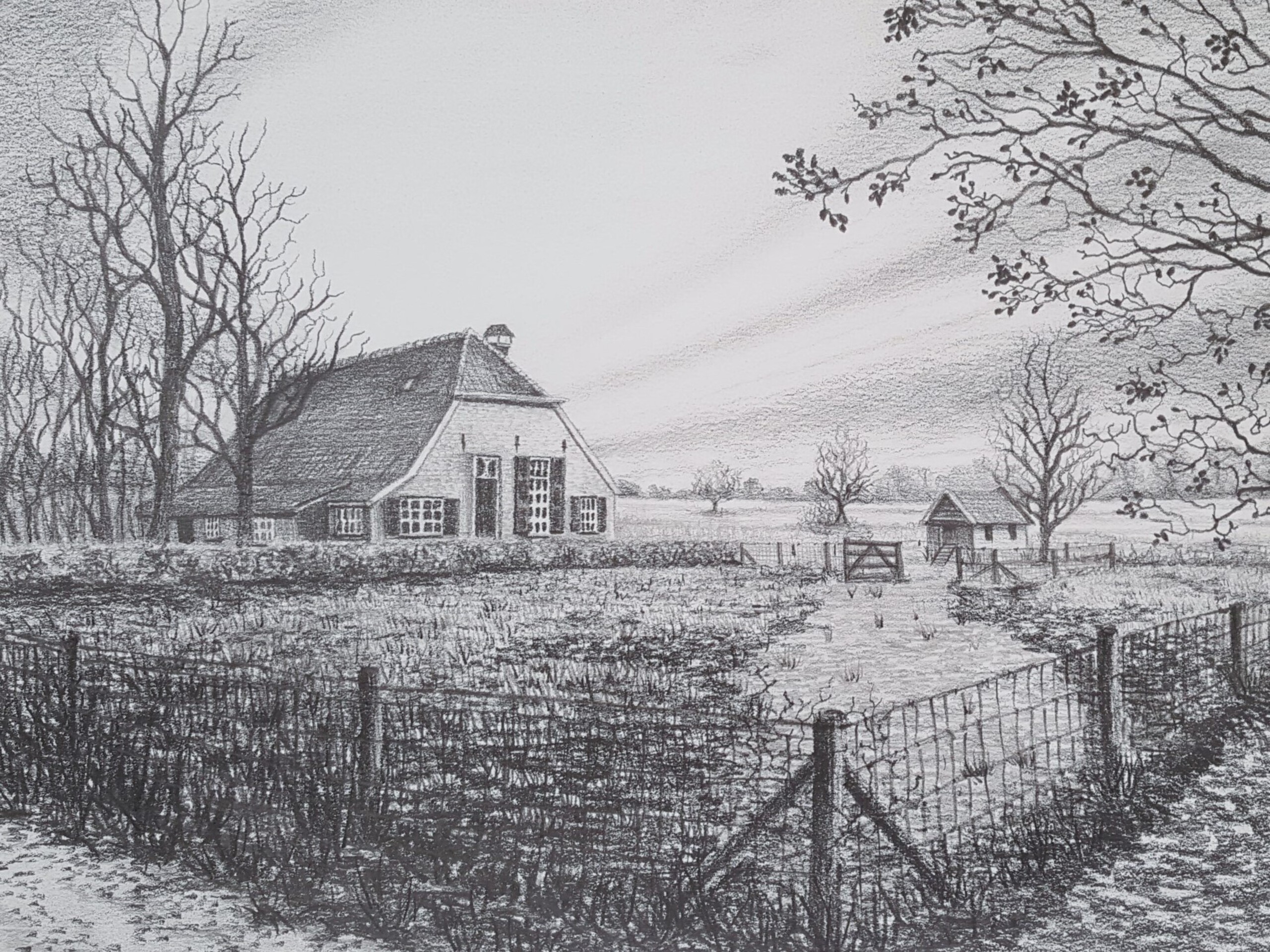 Potlood Tekening Winter Weiland Holland Hek Boerenland Boerderij Zwartwit Nederland