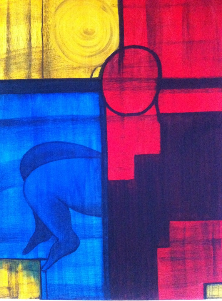Houtskool op acryl. Zwart, rood, geel en blauwe vlakken. Daar in benen , zon , hoofd?