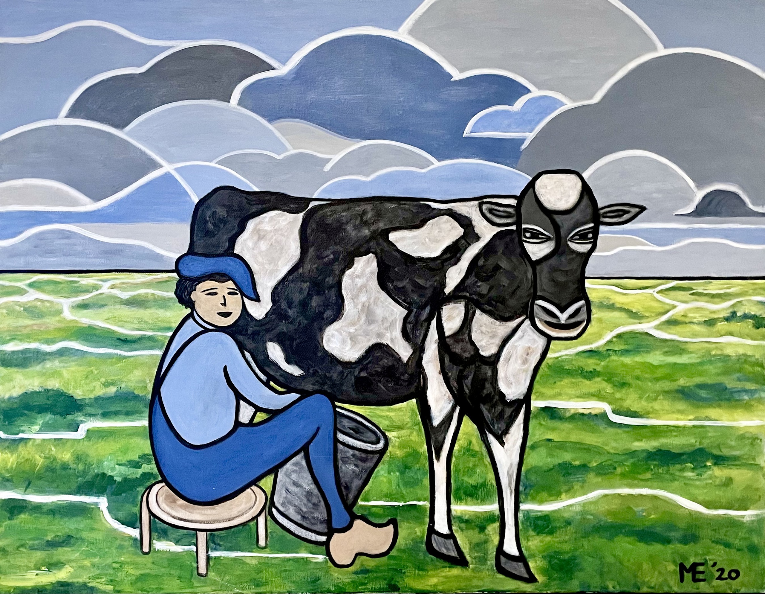 Nostalgisch plaatje van een boer die met de hand aan het melken is. In een zwarte baklijst.