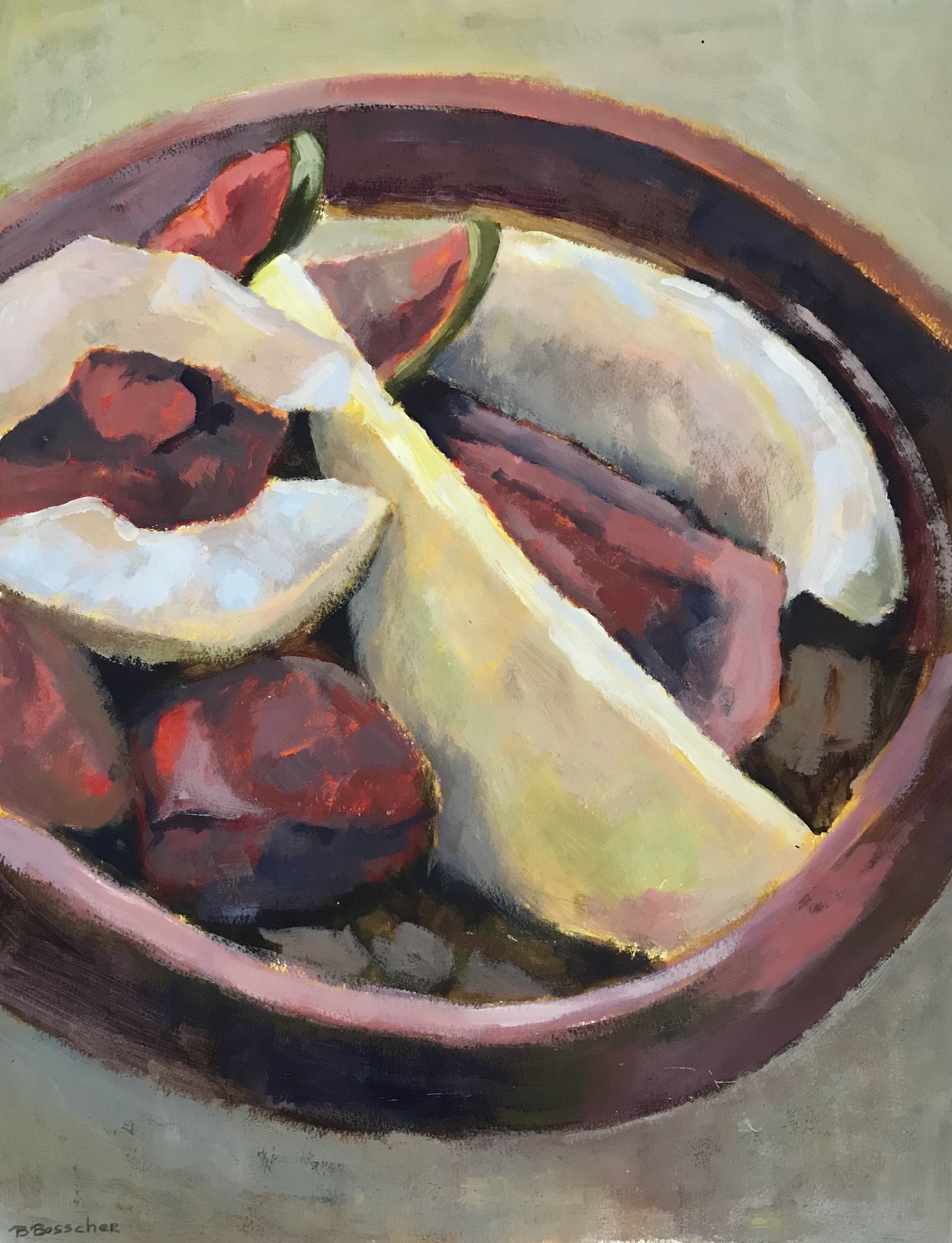 Vruchten in schaal, acryl op papier afmetingen zijn zonder passepartout 70-50cm Het werk is ingelijst met passepartout in een houtenwissellijst . De afmetingen zijn 84-64 cm
