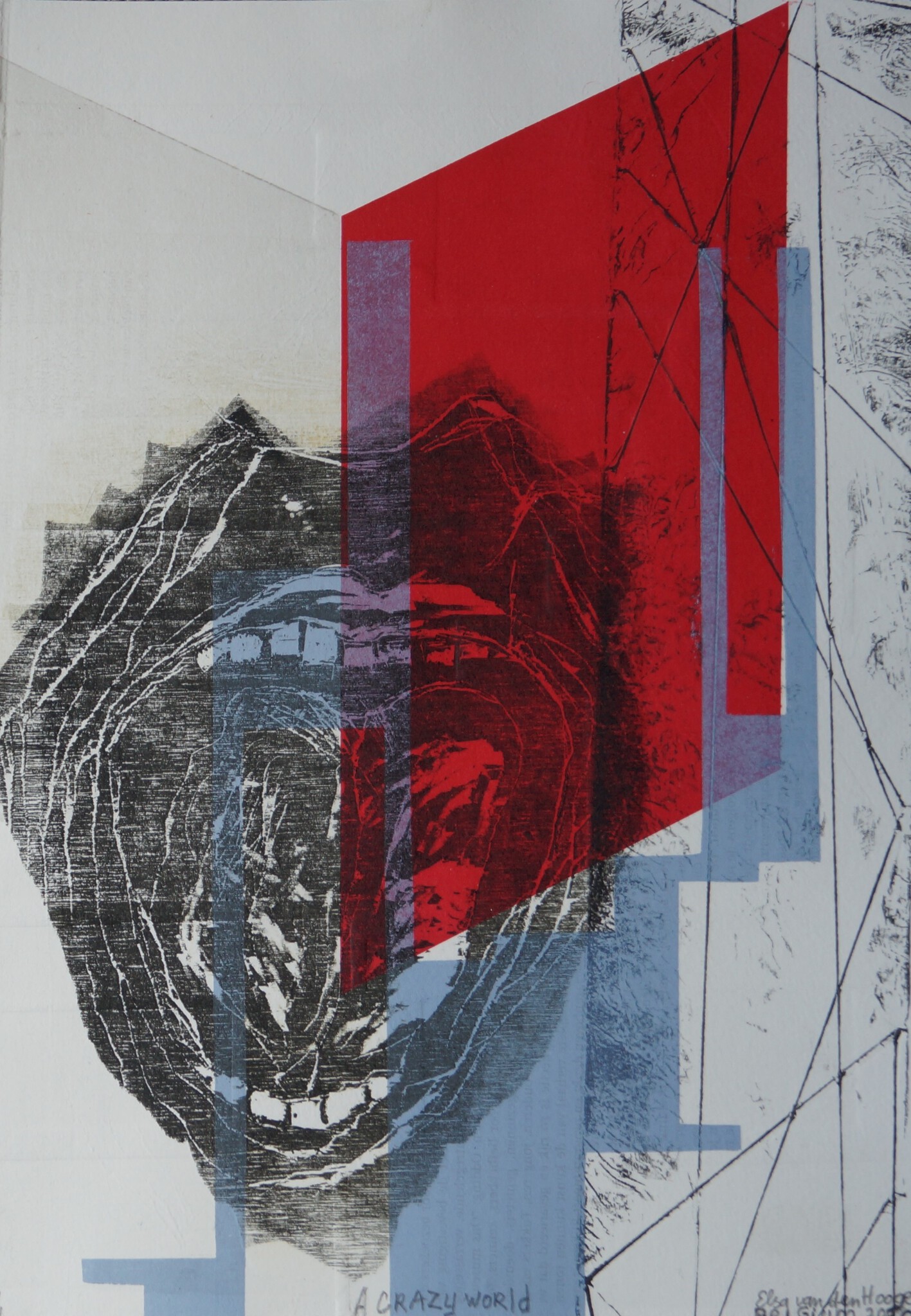 Kunstwerk gemaakt voor Griekse Fluxus beweging Internatioal Mail Art Exhibition. Techniek: Hoogdruk, kartondruk houtdruk. Formaat A4