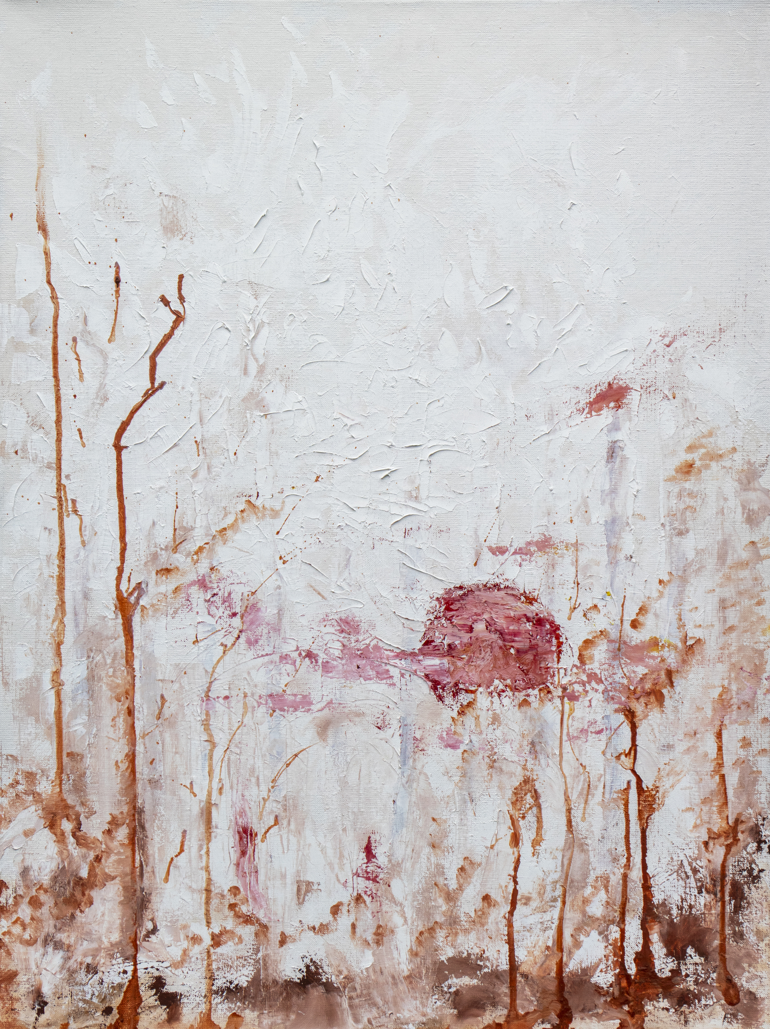 3 schilderijen stonden sinds 2015 onaf in mijn atelier. Door andere werkzaamheden kwam ik er niet aan toe deze af te ronden. Tot in 2020 de vermaledijde corona crisis uitbrak en er opeens tijd was. In deze serie van 3 -net-niet-witte schilderijen brak de zon door, Dit is deel 3 "misty sunset"
