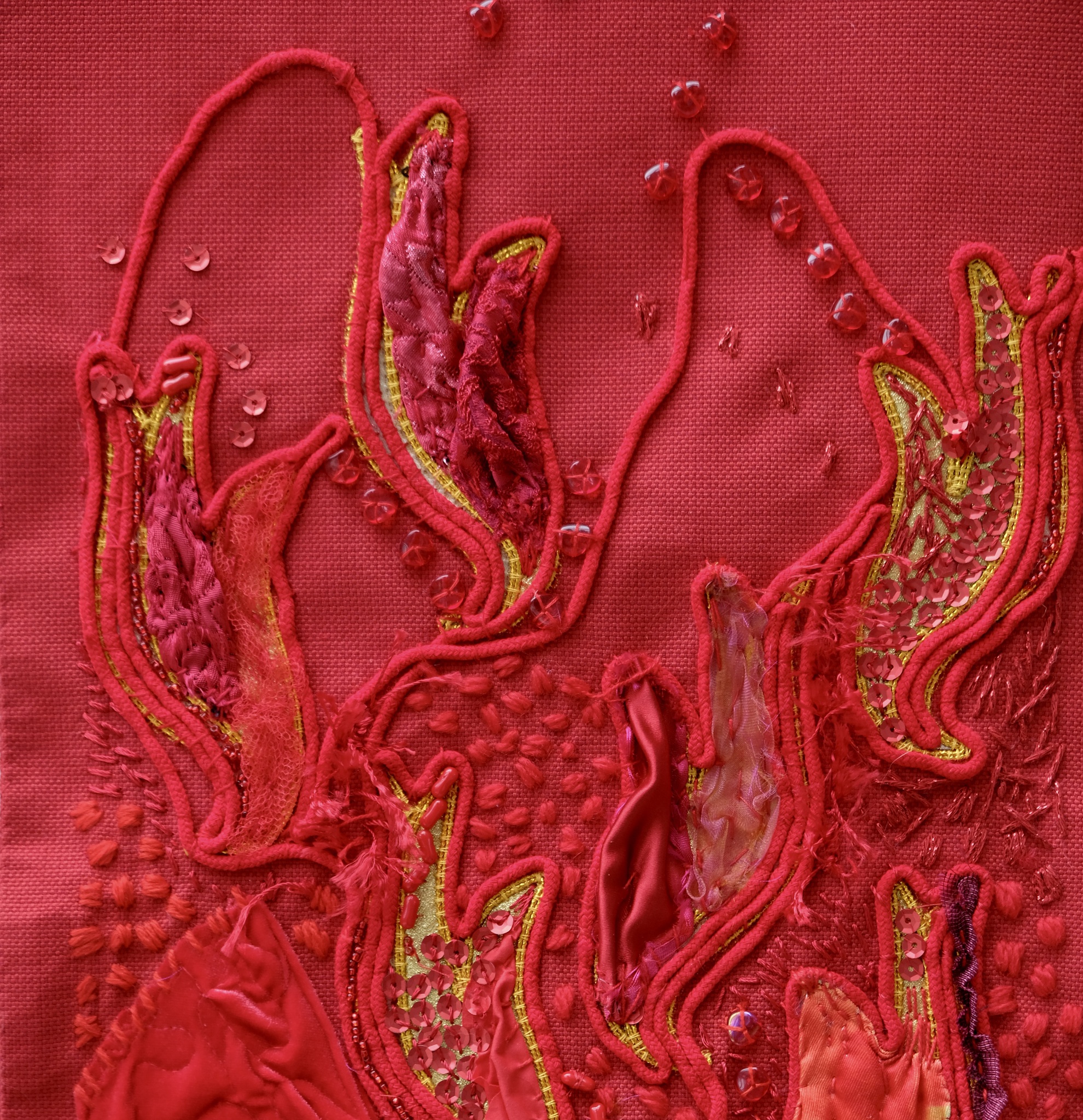 Dubbele kaart (15x15 cm met envelope). Detail rode antependium (Pinksteren) met vuur en vlammen