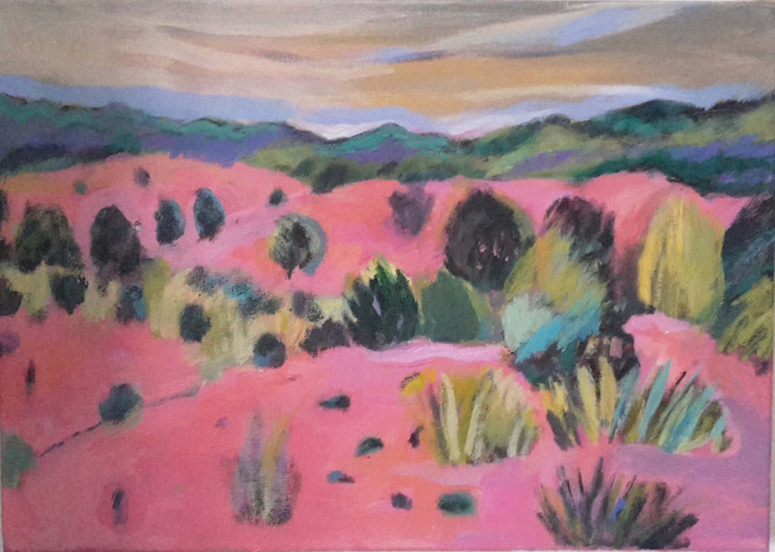 Landschap is mijn toevlucht en inspiratie. Interactie tussen natuur en architectuur is een terugkerend thema in mijn werk. Mijn fascinatie en passie voor landschap vindt zijn oorsprong in mijn achtergrond, en reizen. Eilanden zoals, Tiree, Arran, Harris, The Isle of Man, de Cycladen en de Balearen hebben een diep indruk op mij gemaakt en ook in mijn schilderijen. Felgekleurde luchten, woeste zeeën, mysterieuze heuvels, verlaten stranden, kastelen, kerkjes, megalithische stenen en legenden, vormen een kleurrijk collage aan herinneringen. Tijdens het reizen blijf ik alert op onverwachtse landschappen en weersomstandigheden. Kronen en sieraden zijn kleine relikwieën, die weerspiegelen mijn nostalgie en passie voor mysterieuze oorden.