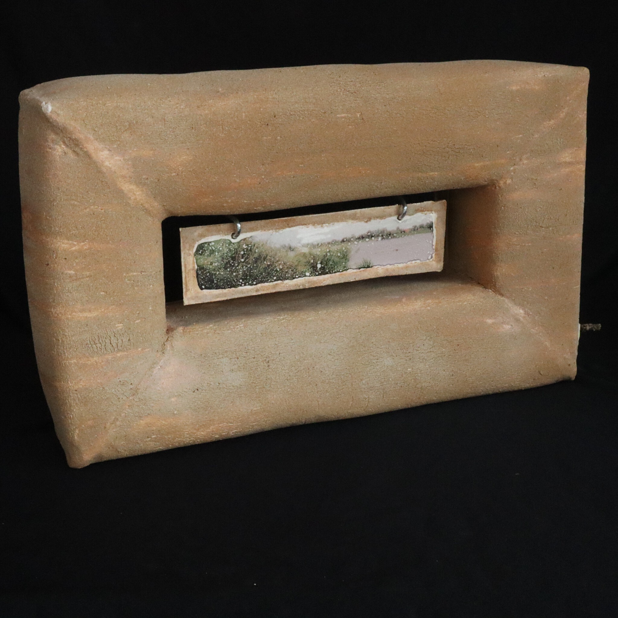 Een uit 1 lap gevouwen doorkijkje met daarin hangend keramiek tegel met 2 foto transfers van de vindplaats van de klei slib. Aan de buitenkant zit een laag slib uit de grond van de Gelderse IJssel, vlakbij Kampen. Met lade waar een blanco keramiektegel inzit, eventueel zelf te voorzien van leuke foto.