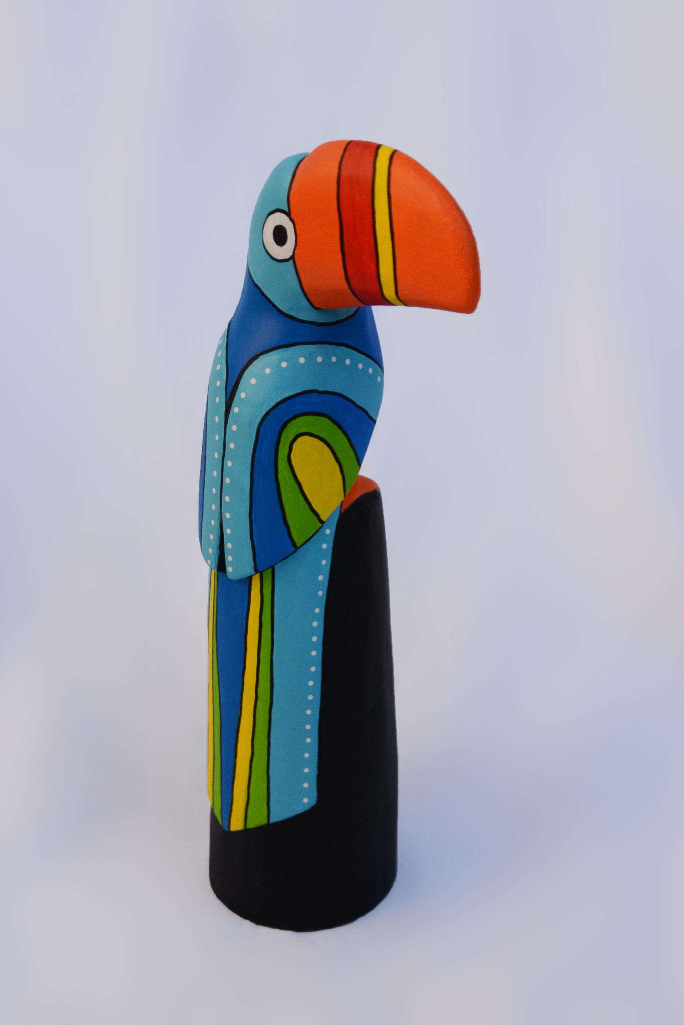 Modern beschilderde vogel met geometrische vormen en felle kleuren. Vormt een set samen met de P-p-papegaai. Hier zie je werk uit de serie ‘Beelden met een tweede leven’. Dit zijn oude, houten beelden die ik heb gerepareerd en moderne, veelal kleurrijke beschilderingen heb gegeven. Hierdoor verdwijnen de versleten beelden niet in de afvalbak, maar kunnen ze een tweede leven leiden. Zo is ieder beeld duurzaam en uniek!