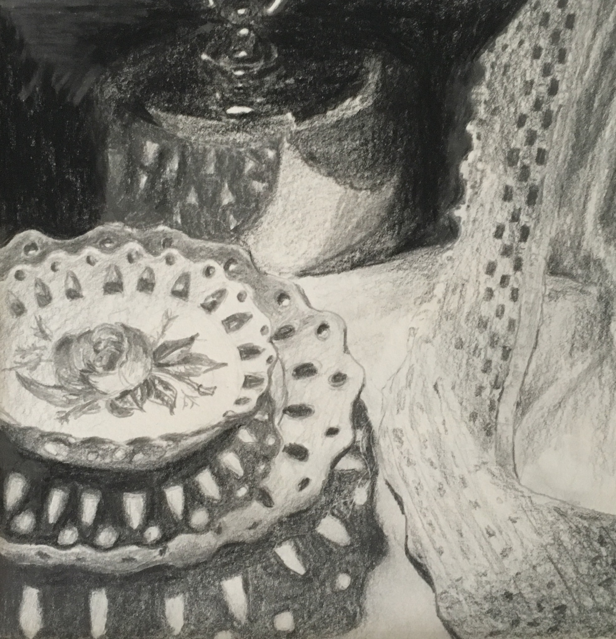 Getekend stilleven van opengewerkt porselein en kleedje.