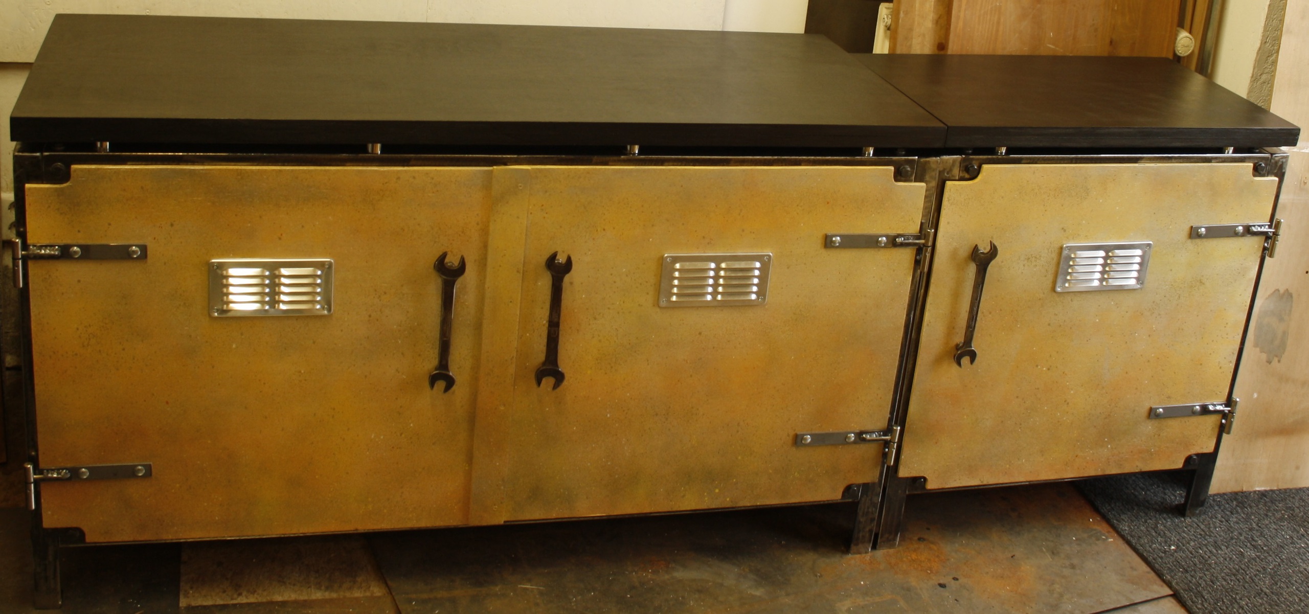 Kleine jongens worden groter... Het interieur van een kinderkamer past niet meer bij een 16-jarige. Er mocht een stoere kast komen waar veel 'rommel' in past. Op een nieuw metalen kastframe heb ik het hout van de oude kast hergebruikt en met spuitwerk en zelf gemaakte robuuste handgrepen er een sterke kast van gemaakt.