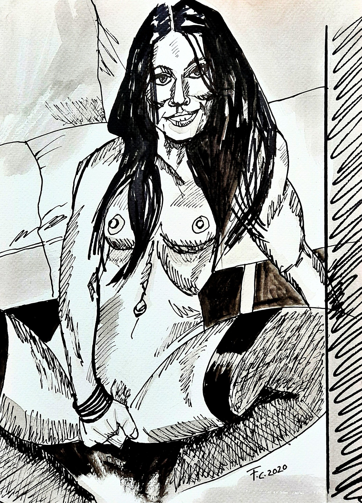 Wit Zwart Vrouw Schets Inkt Lingerie Sexy Erotiek Naakt