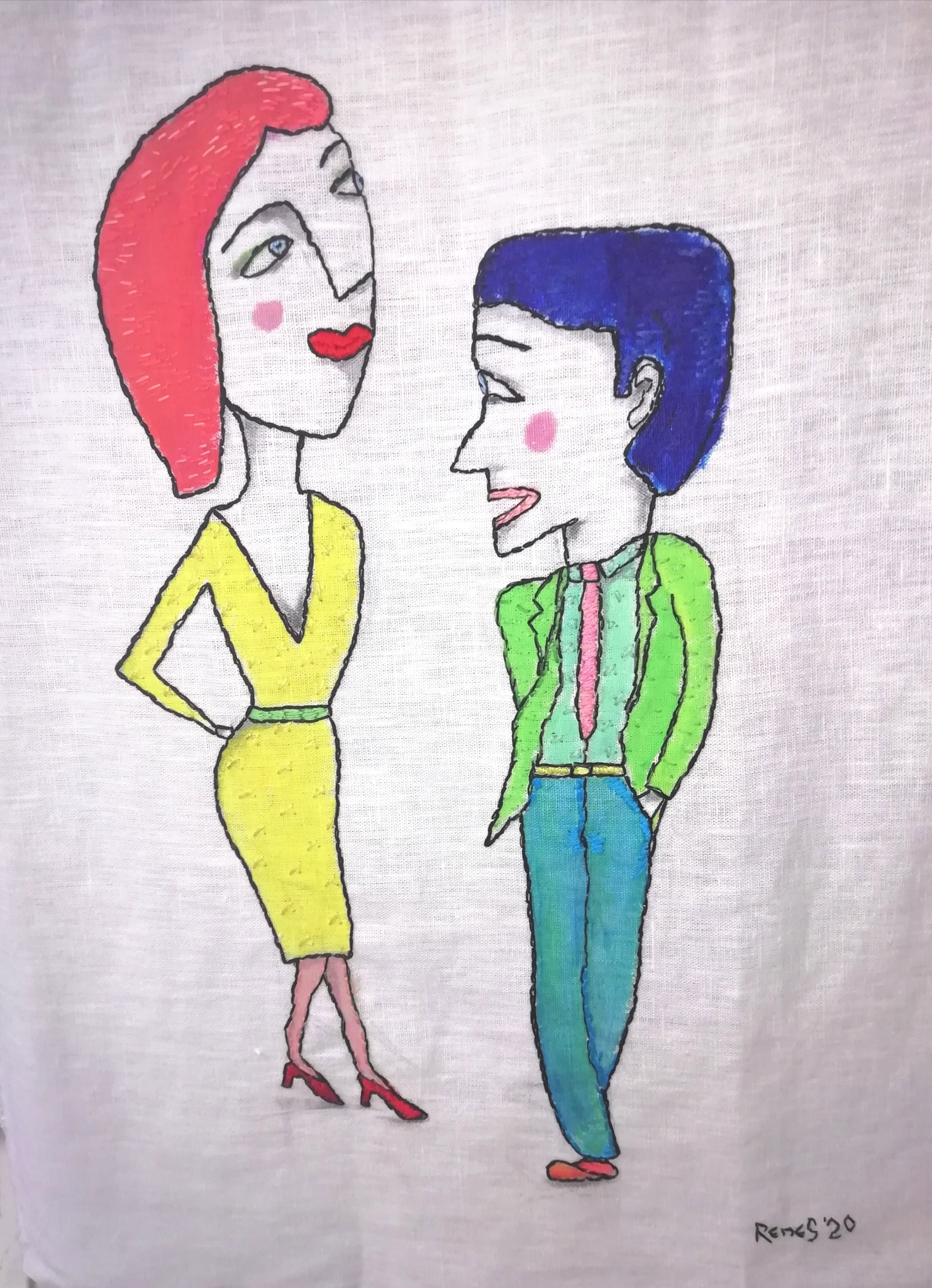 Dit werk is een combinatie van textielverf en borduurwerk op linnen.