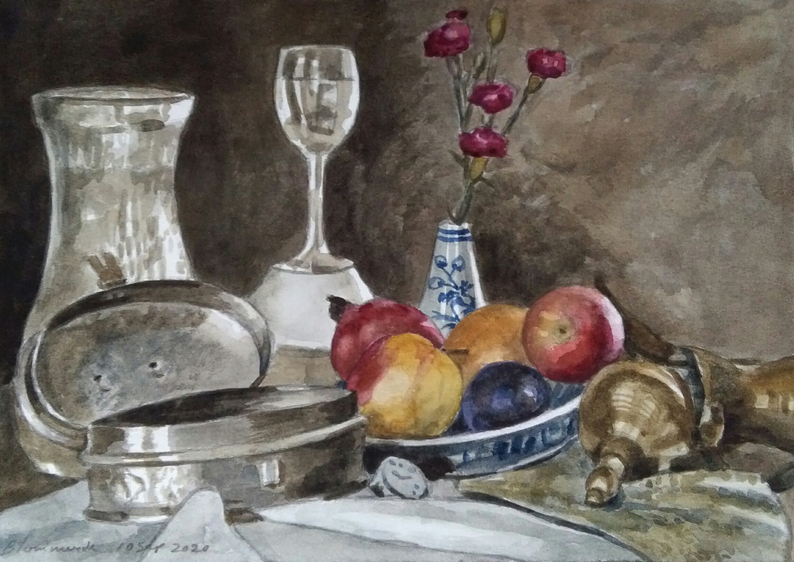 Aquarel met glas water, glazen vaas, fruit, metalen doosje en koperen schenkkan