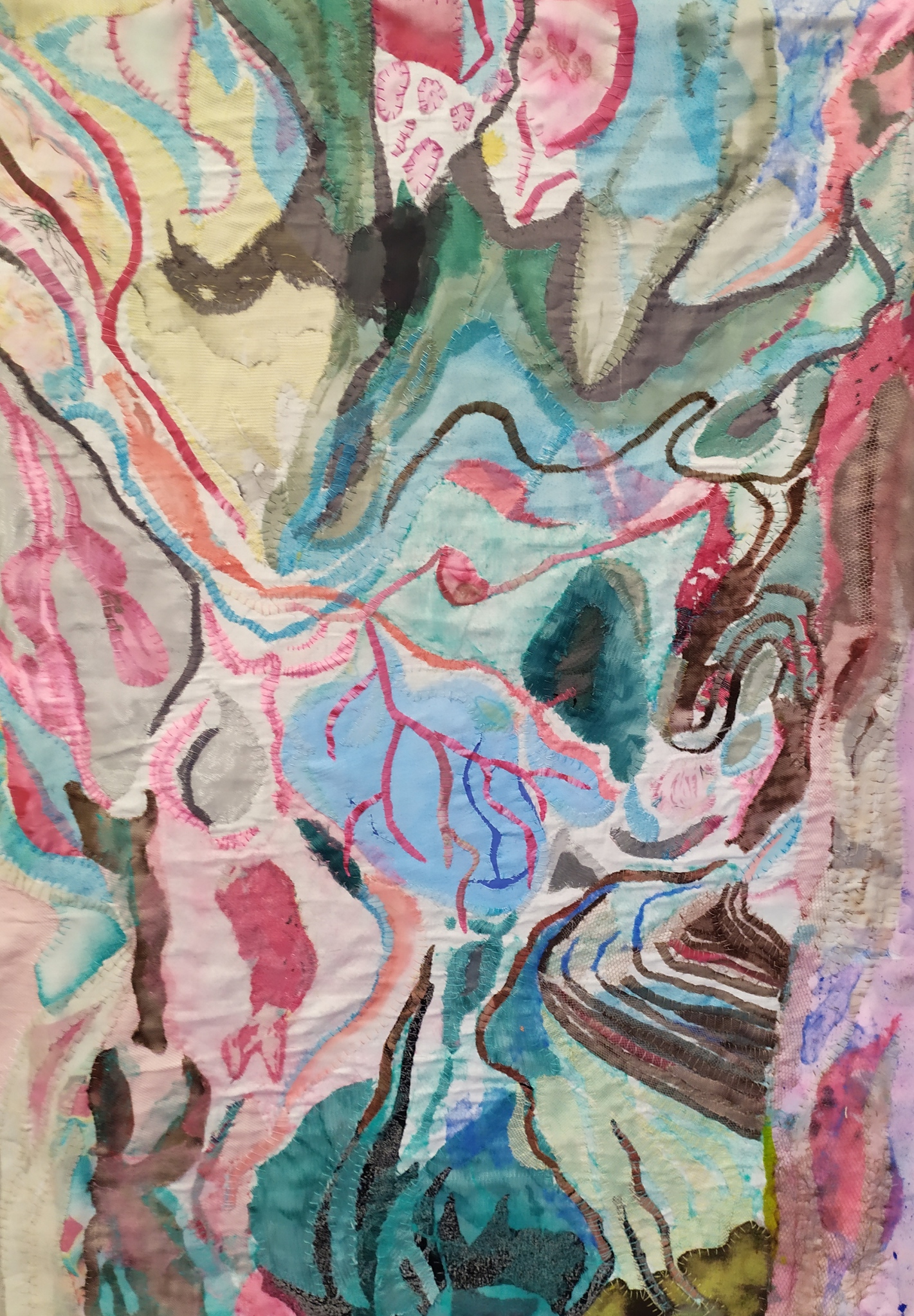 Ebru (verven op water) ontwerp gemaakt op textiel A4. Daarna vergroot en geheel van textiel gemaakt.