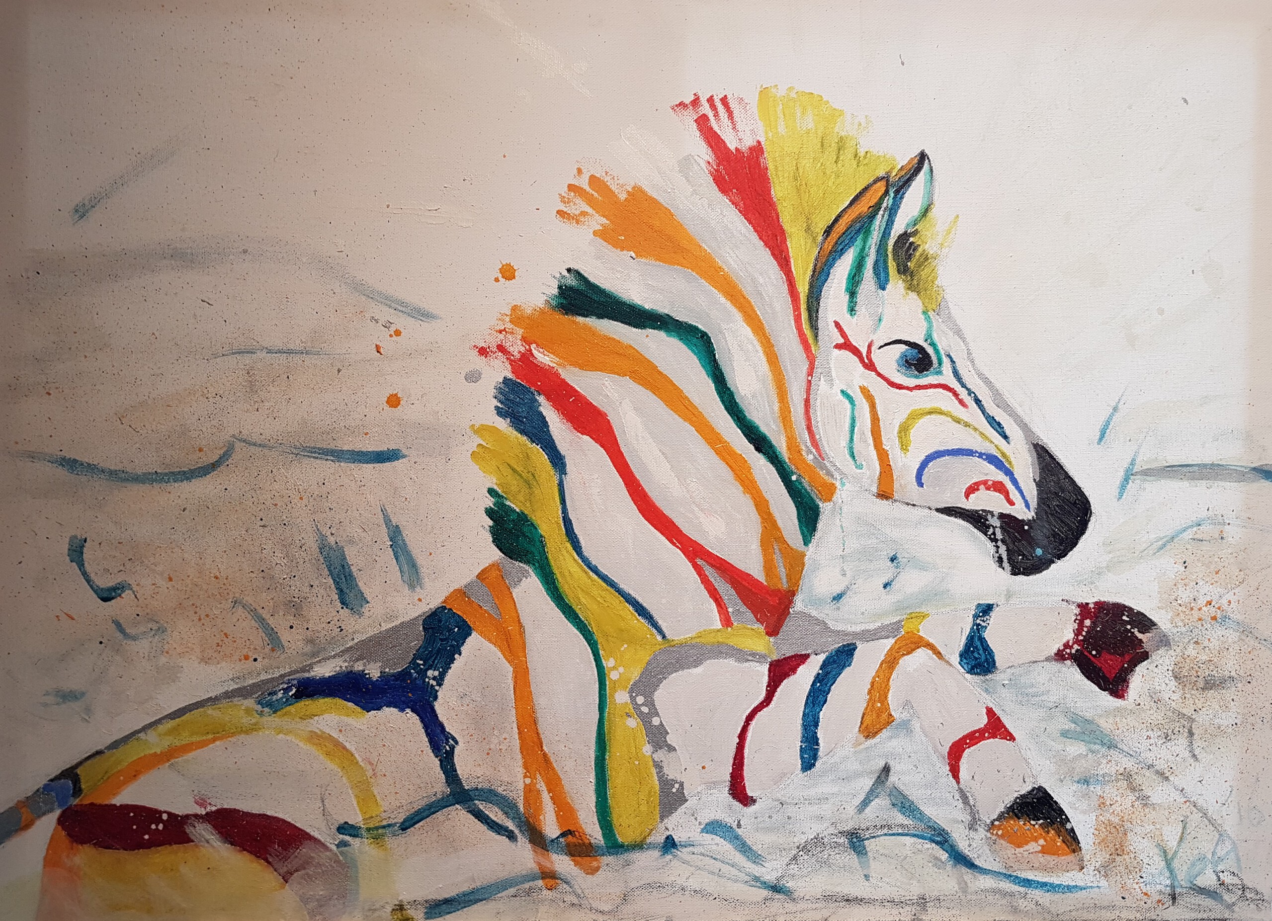 Mijn dochter ging, het huis uit, studeren en op kamers wonen. Ik vond de zebra wel symbolisch voor de kleurrijke veranderingen in haar en ons leven. De zebra neemt onverschrokken de sprong naar de overkant.