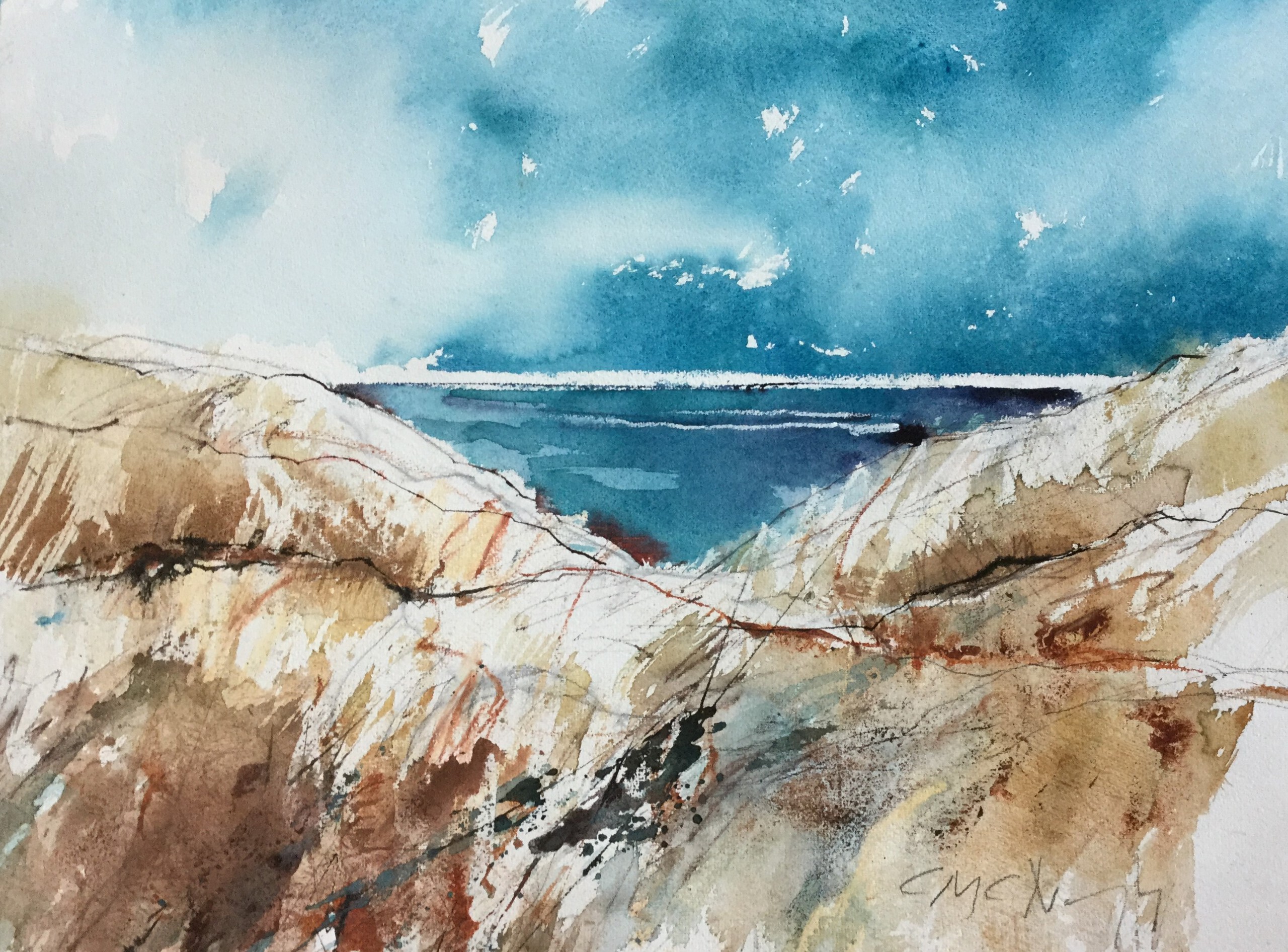 Een aquarel gemaakt in het duingebied bij Bergen aan zee . De duinen hebben veel structuur ,gemaakt met vetkrijt en aquatones. Op dit moment is dit schilderij verhuurd.