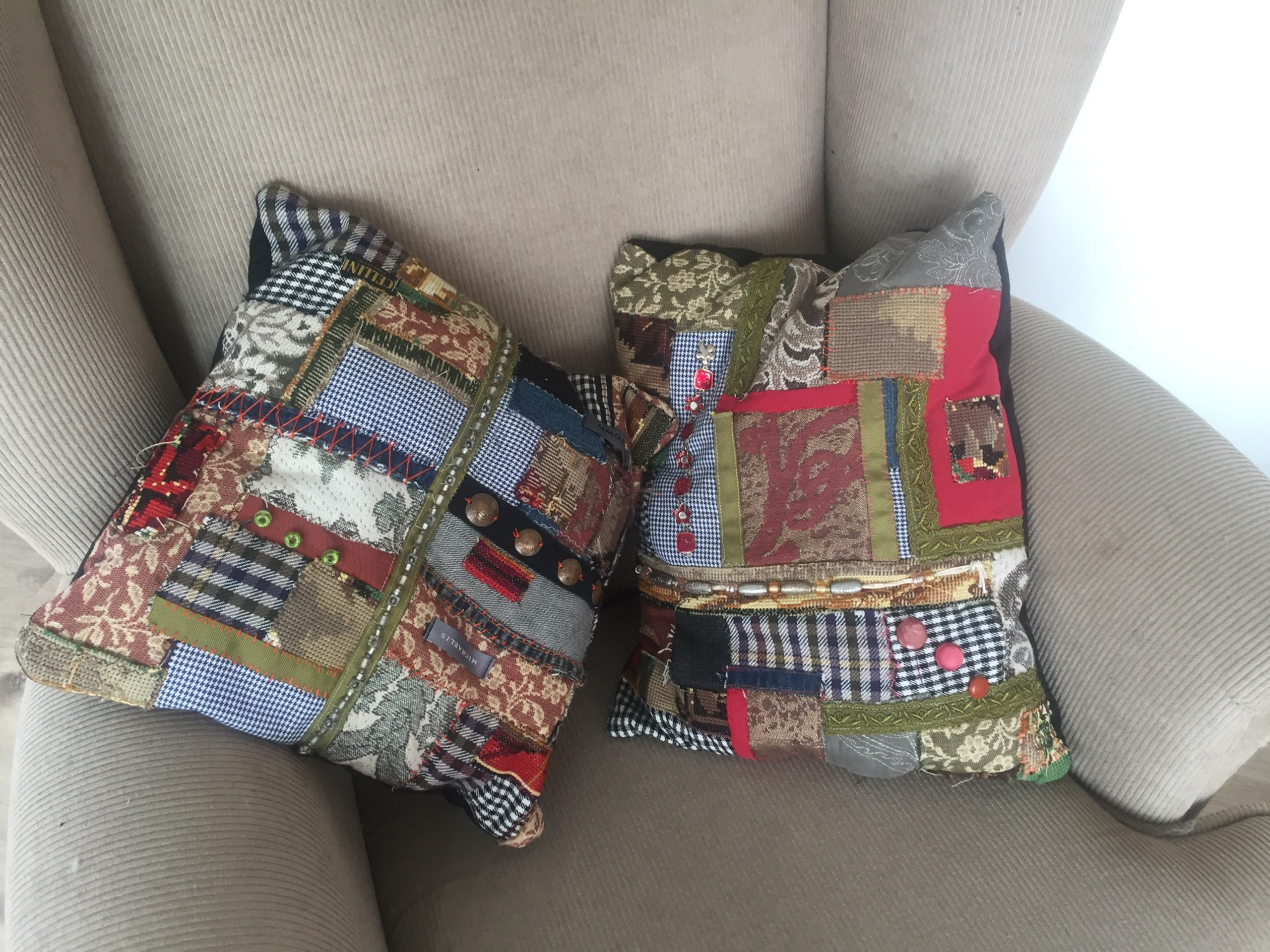 2 kussens uitgevoerd in speciaal patchwork techniek, gebruik makend van kleding en sieraden van de overledene